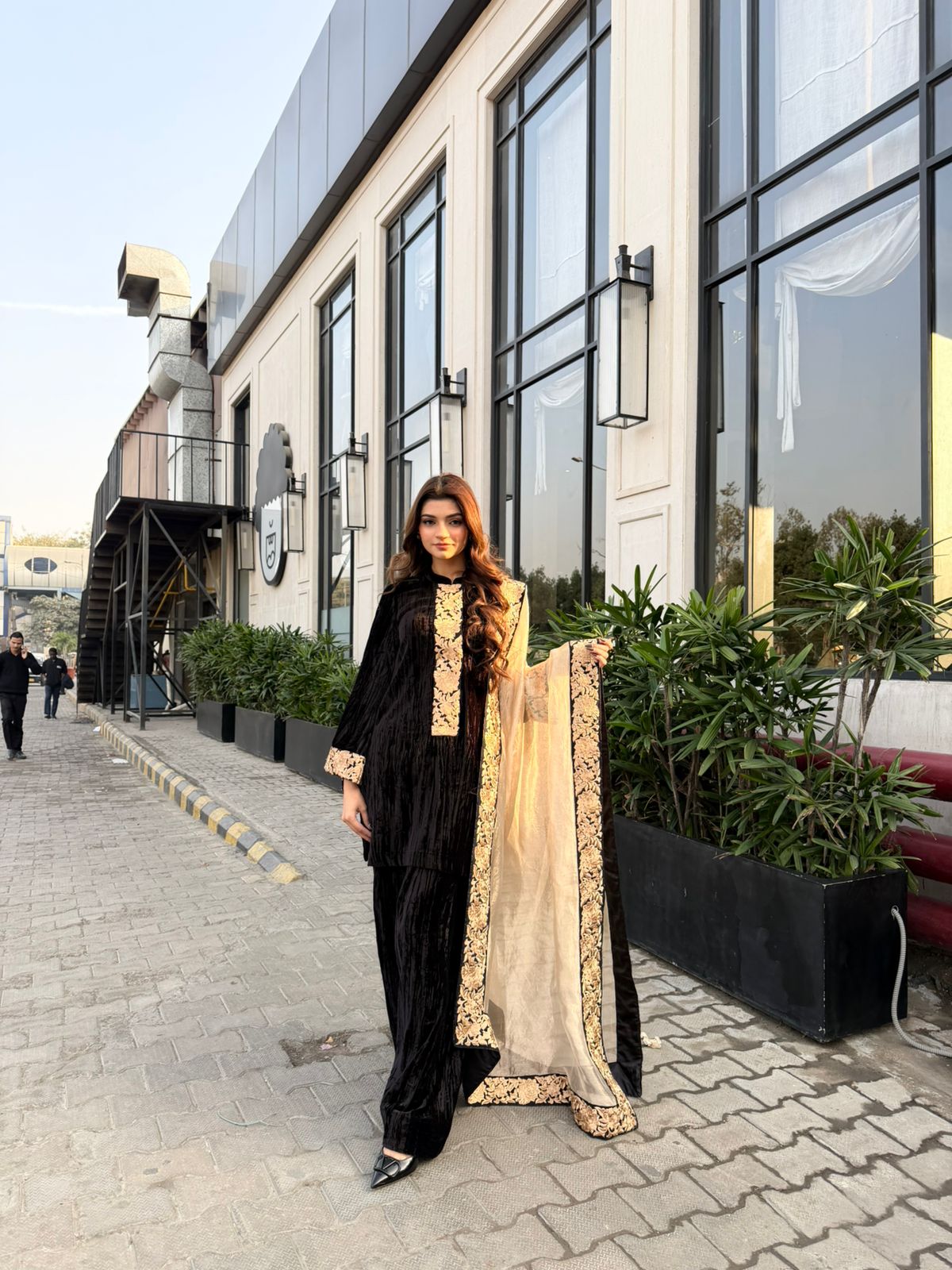 A masterpiece is evocative of style and elegance. An ensemble for summery days and starry nights. Teamed with a self striped soft chanderi dupatta in the same colour palette and tulip pants.