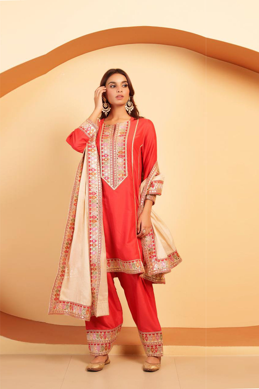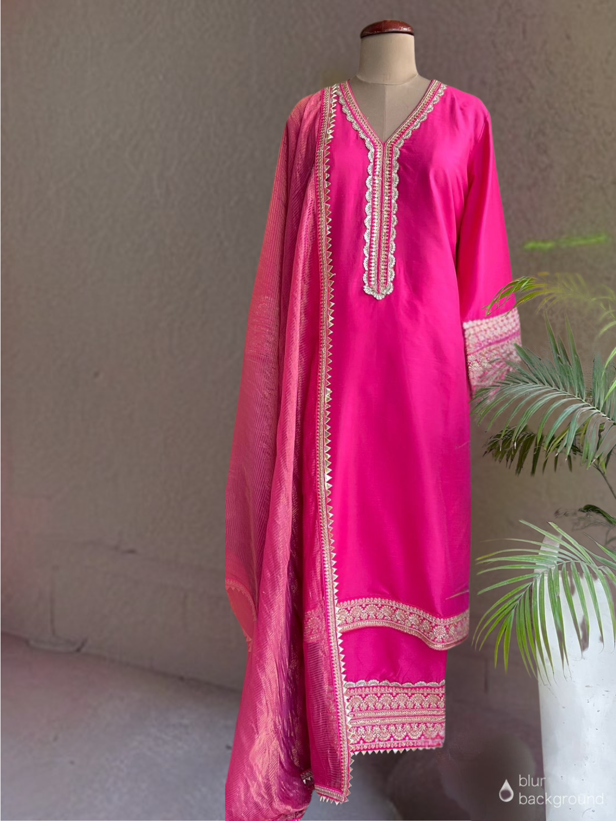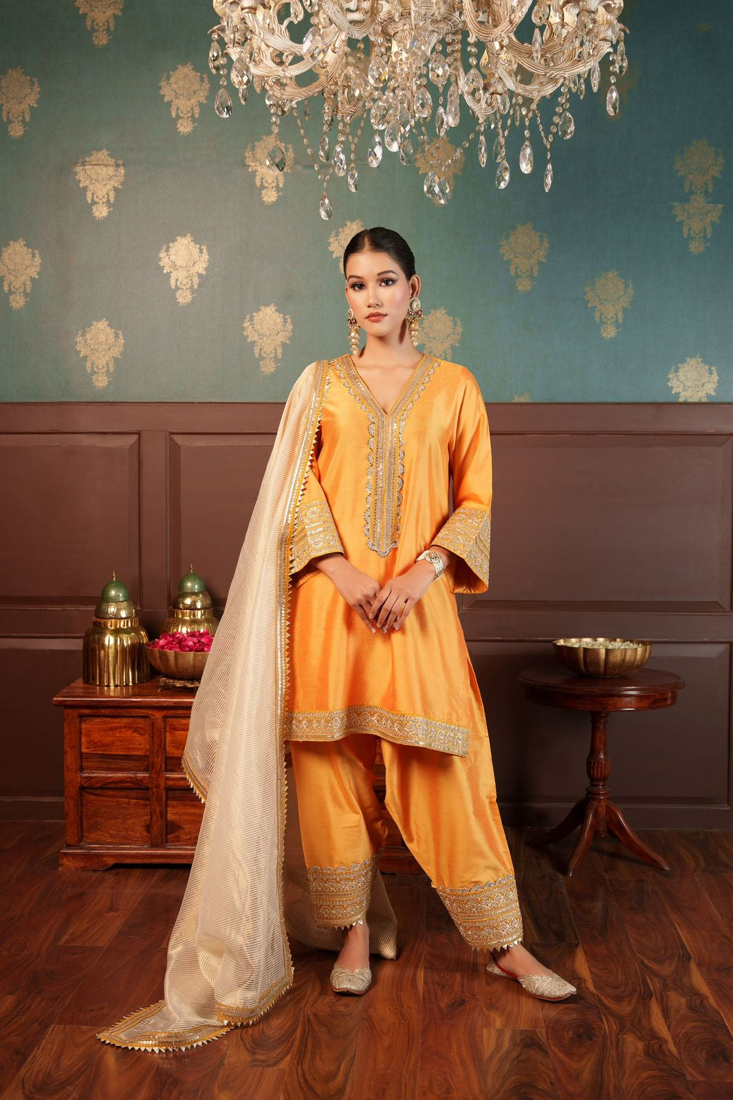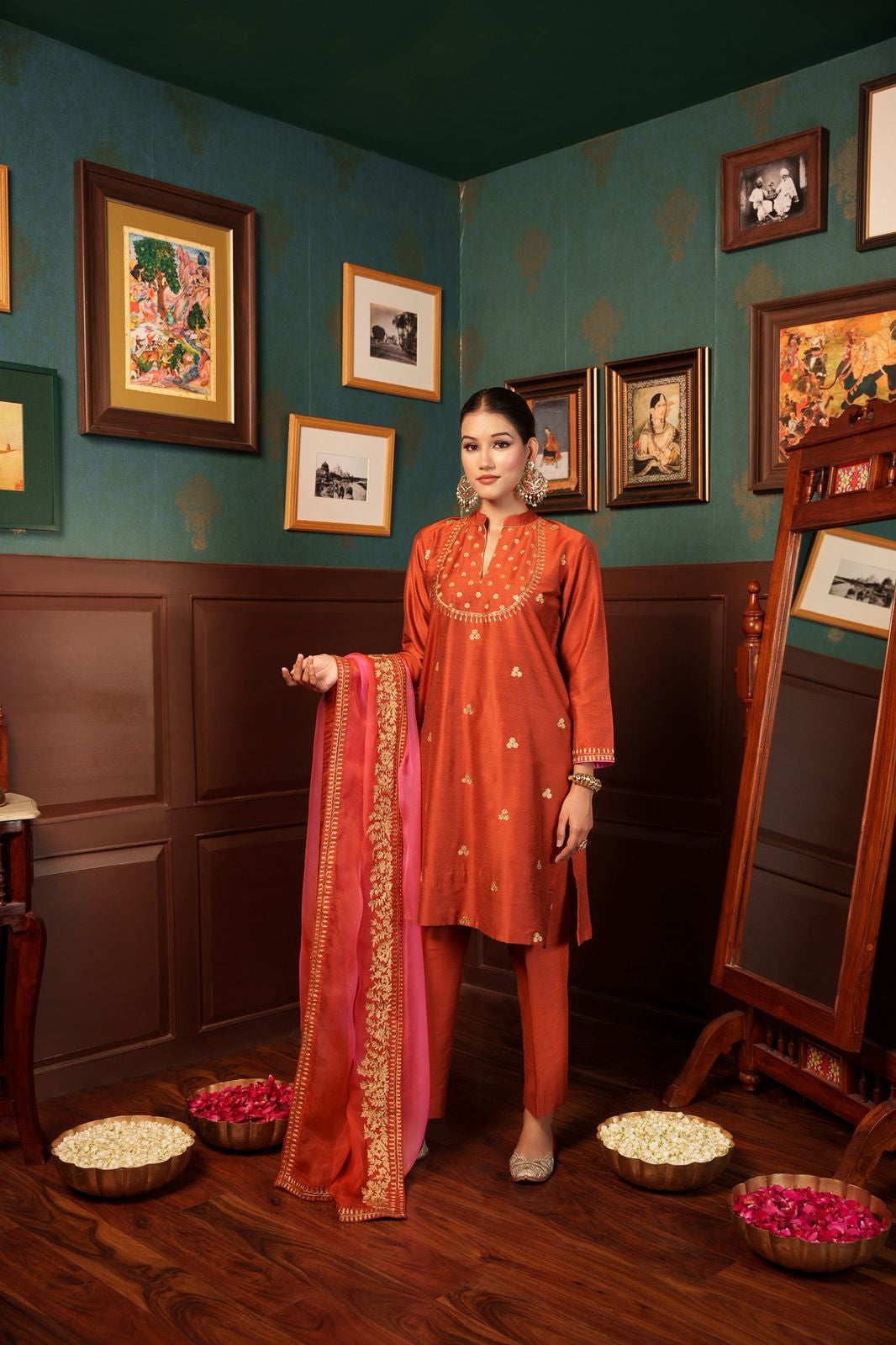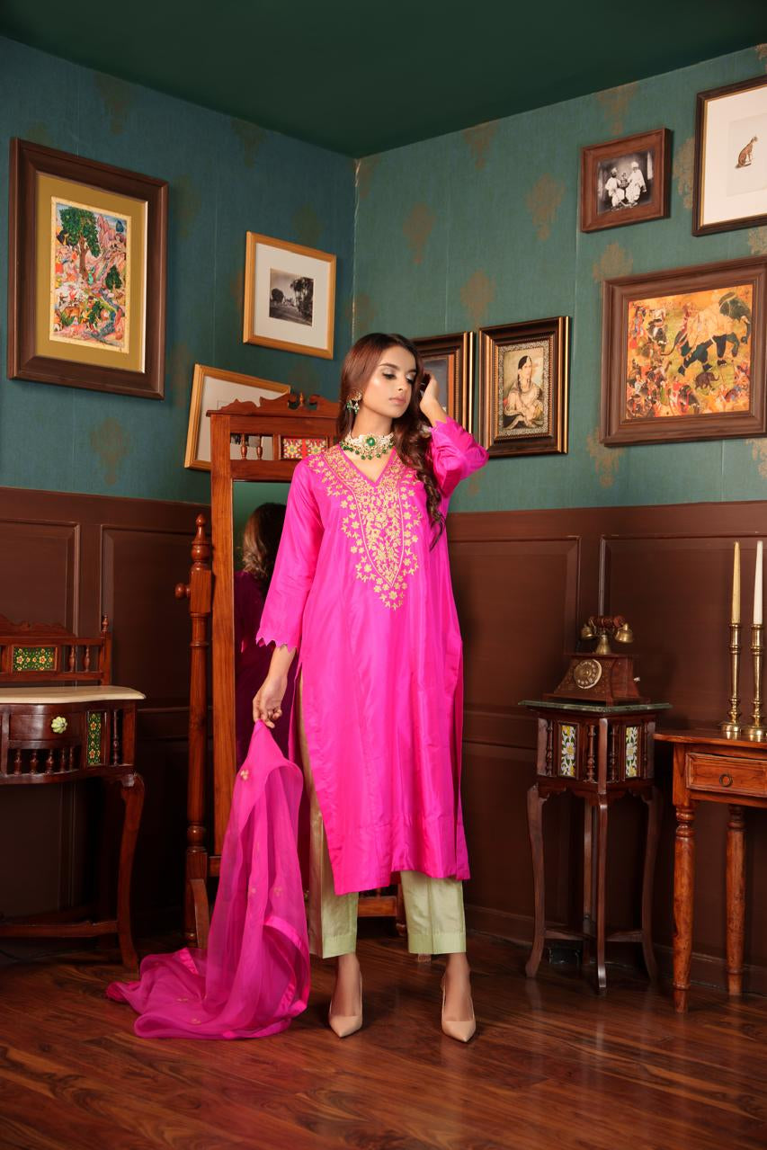 A masterpiece is evocative of style and elegance. An ensemble for summery days and starry nights. Teamed with a self striped soft chanderi dupatta in the same colour palette and tulip pants.