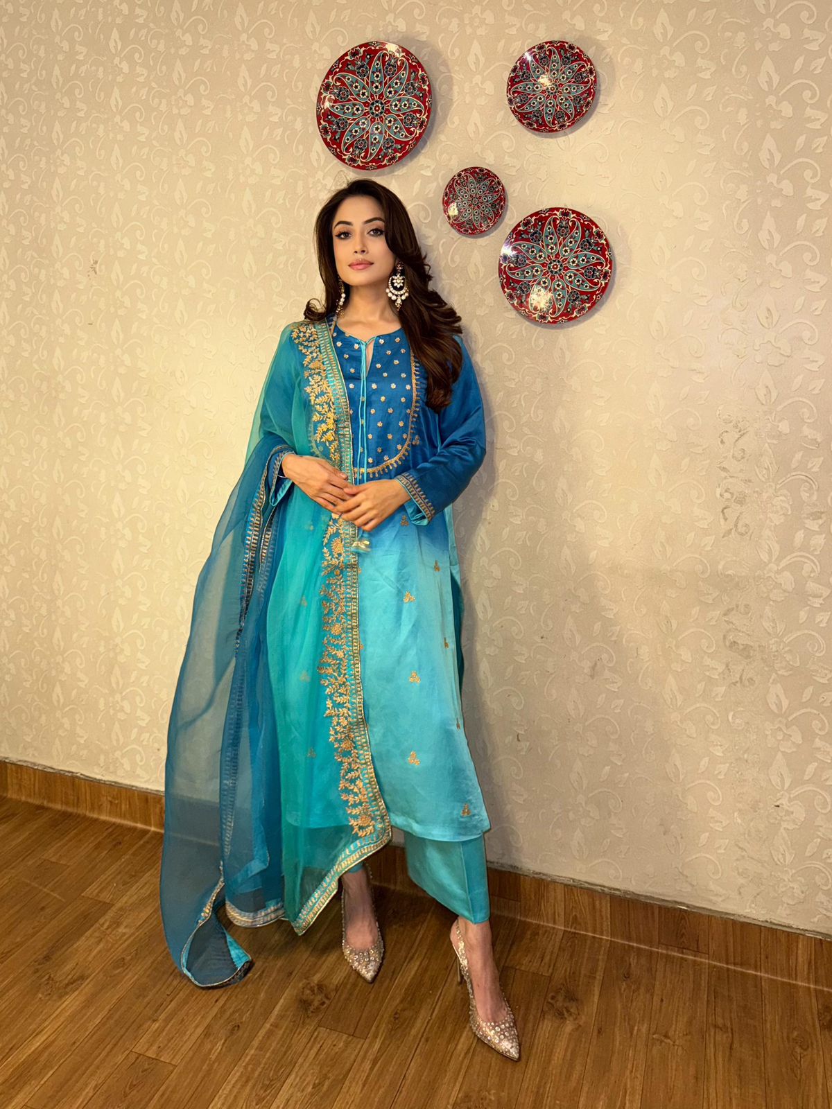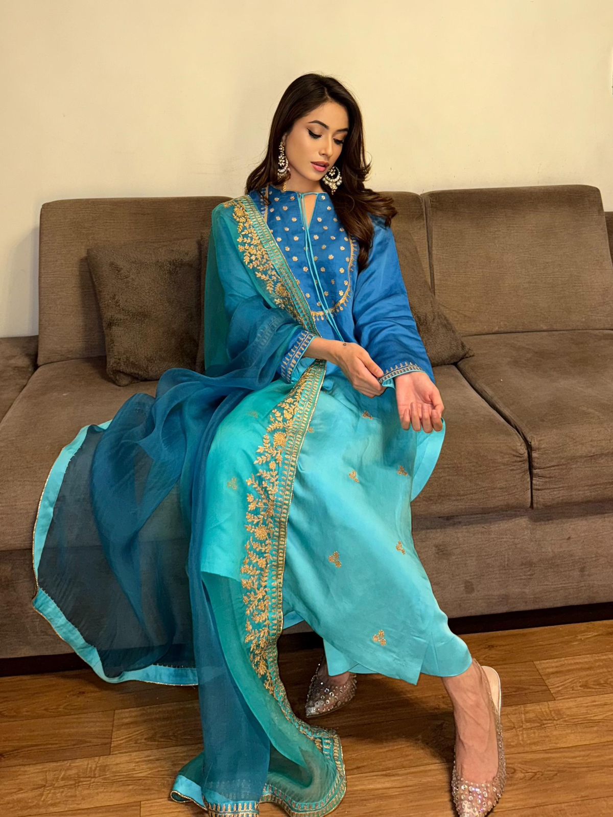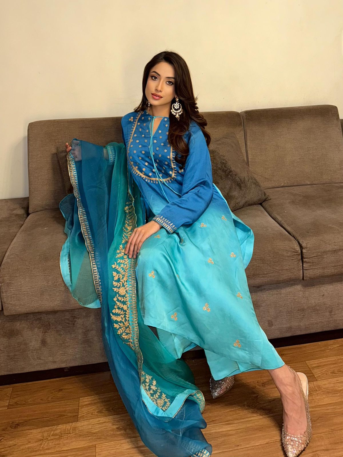 Delicate Aari embroidery with dynamic details on a shaded blue kurta. It’s paired with a shaded organza duppatta to enhance your look this season!