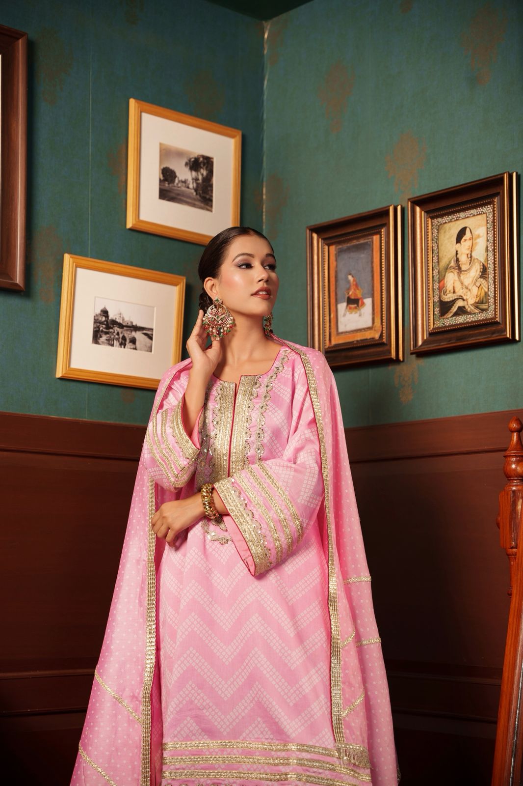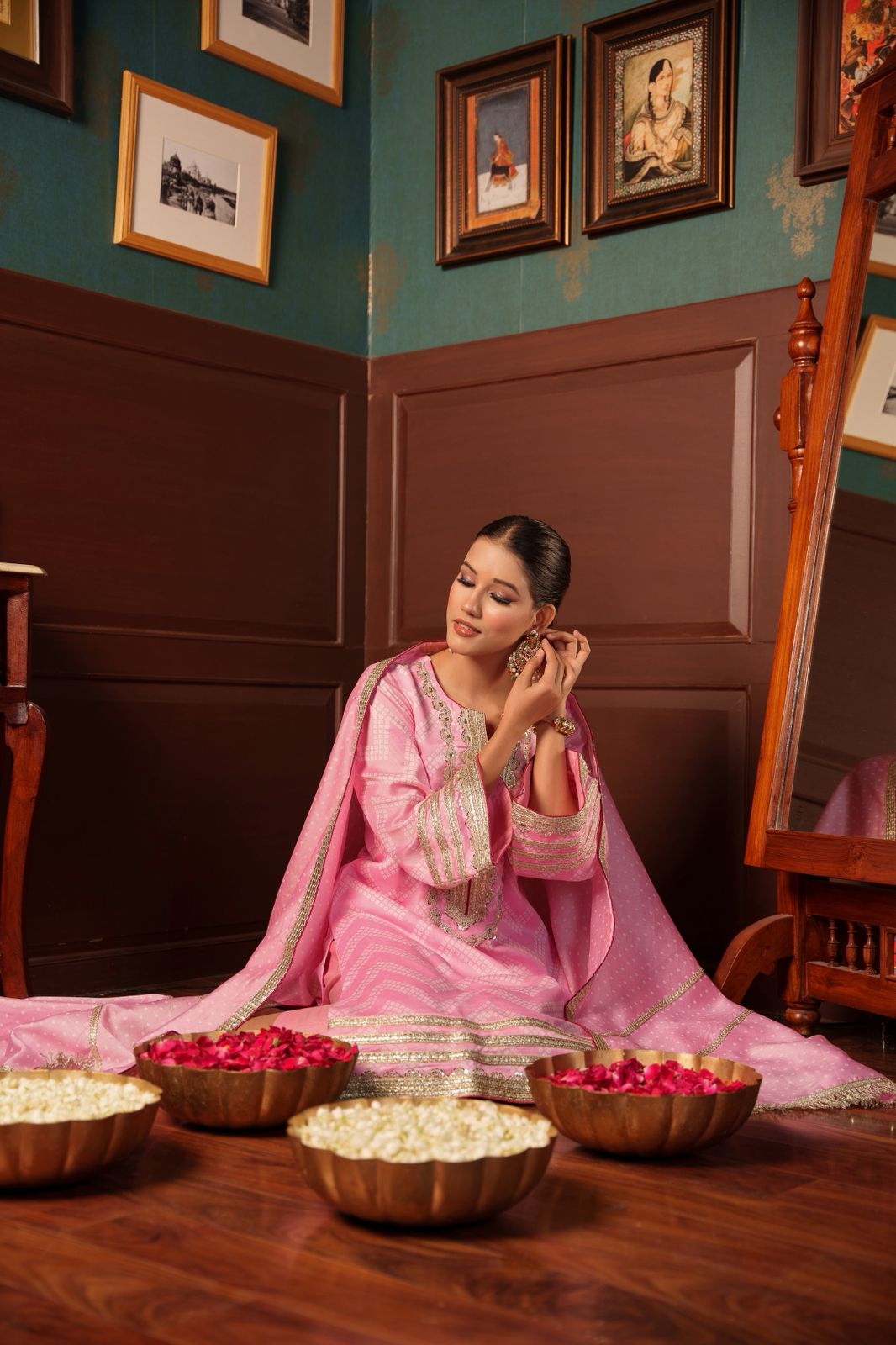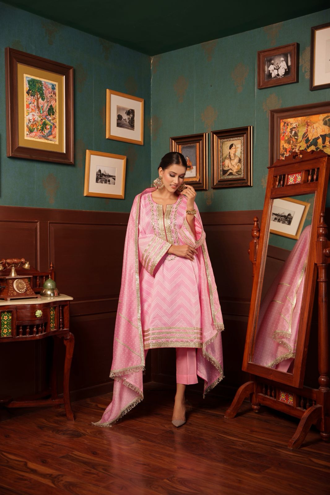 Wear this Pretty pink ensemble in Chanderi silk featuring style and elegance together. Completed with matching Pink pants and a duppatta giving it the look of the season. Its surely a perfect choice for the festive season .