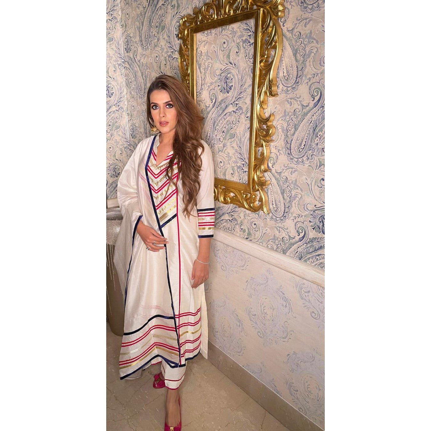 This ivory pearl kurta is artfully created with geometric patterns in colours of indigo, cranberry red and magenta. A hint of gold and silver gives it the much-needed glamour. The light Chanderi silk dupatta is also enhanced with a matching pattern. This style will liven and glam up any occasion.