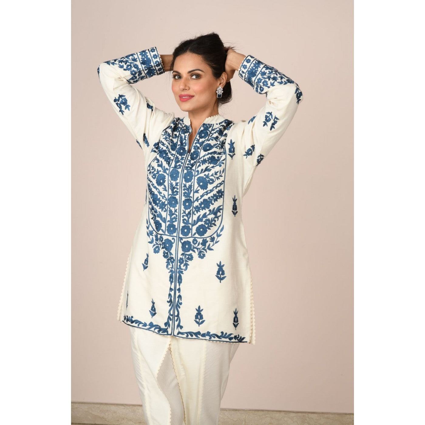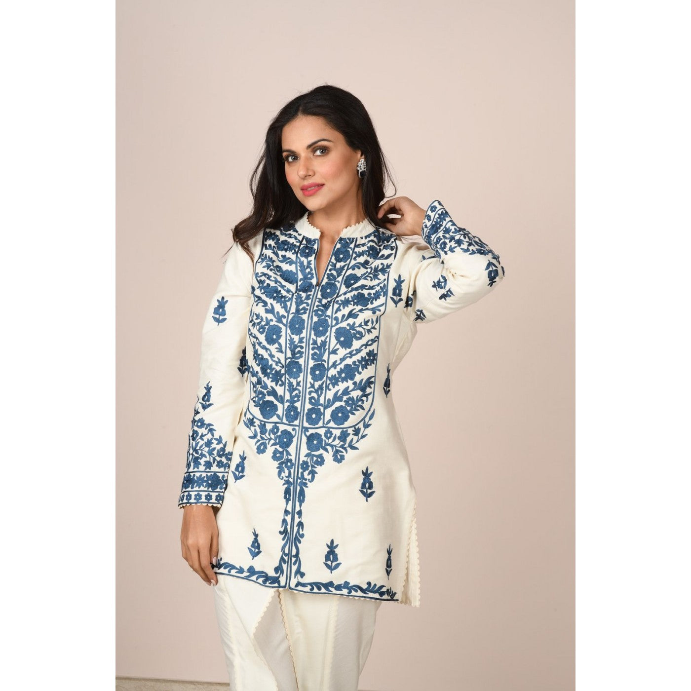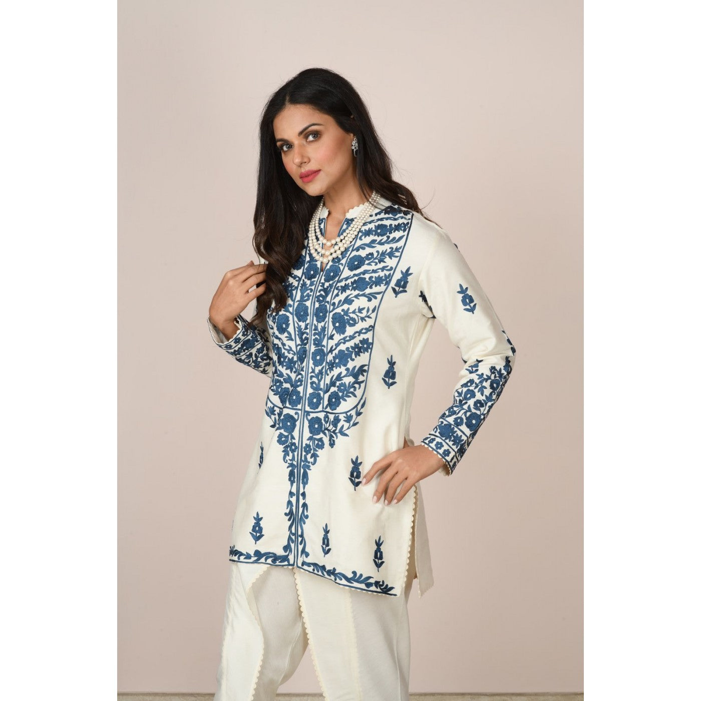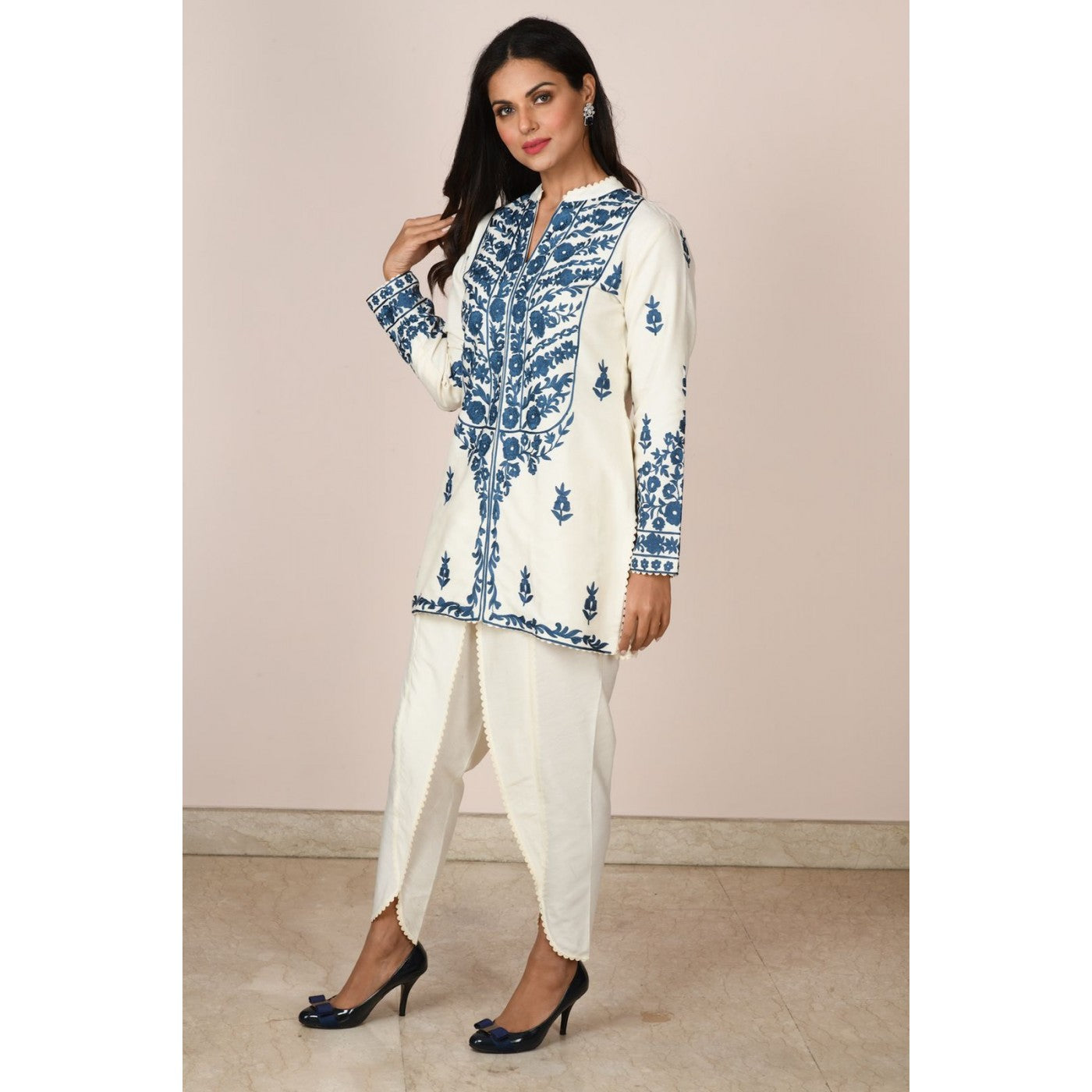 Turn heads in this ivory cotton silk short kurta with indigo blue embroidery. Paired here with tulip pants which are also finely finished with self lace.