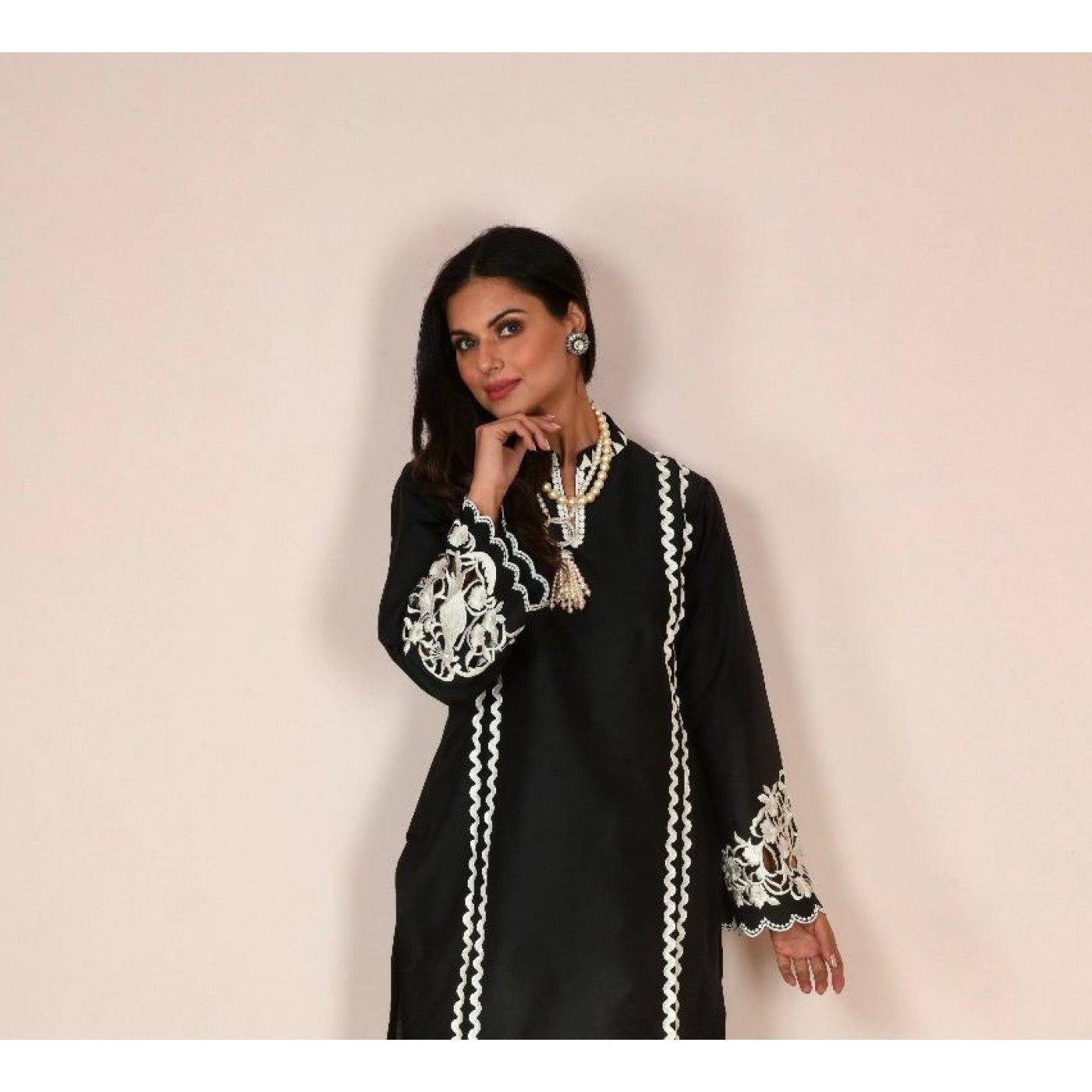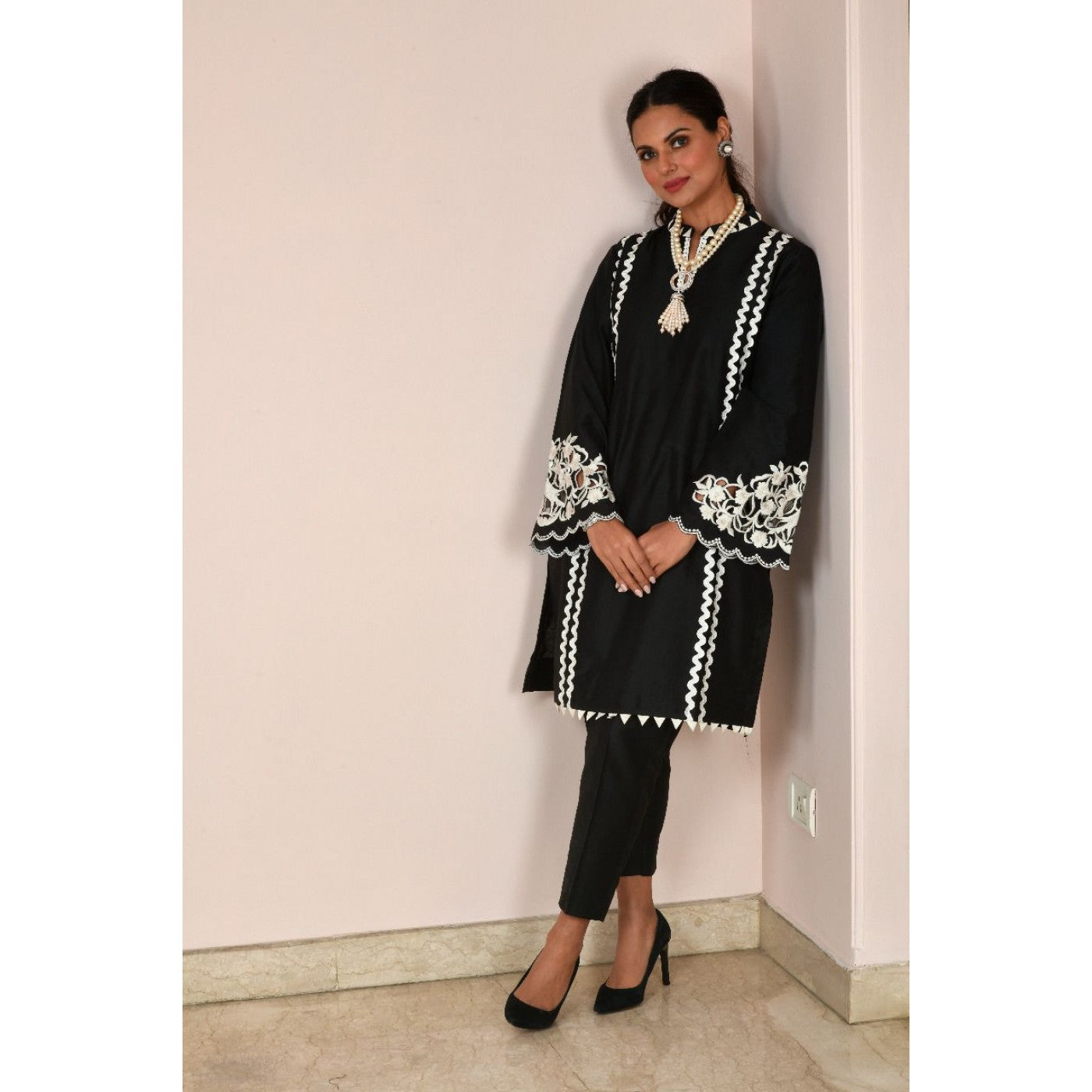 The geometrically designed neckline, the bold embroidered cutwork on the sleeves gives it that polished modern look !! Styled here with fitted pants.