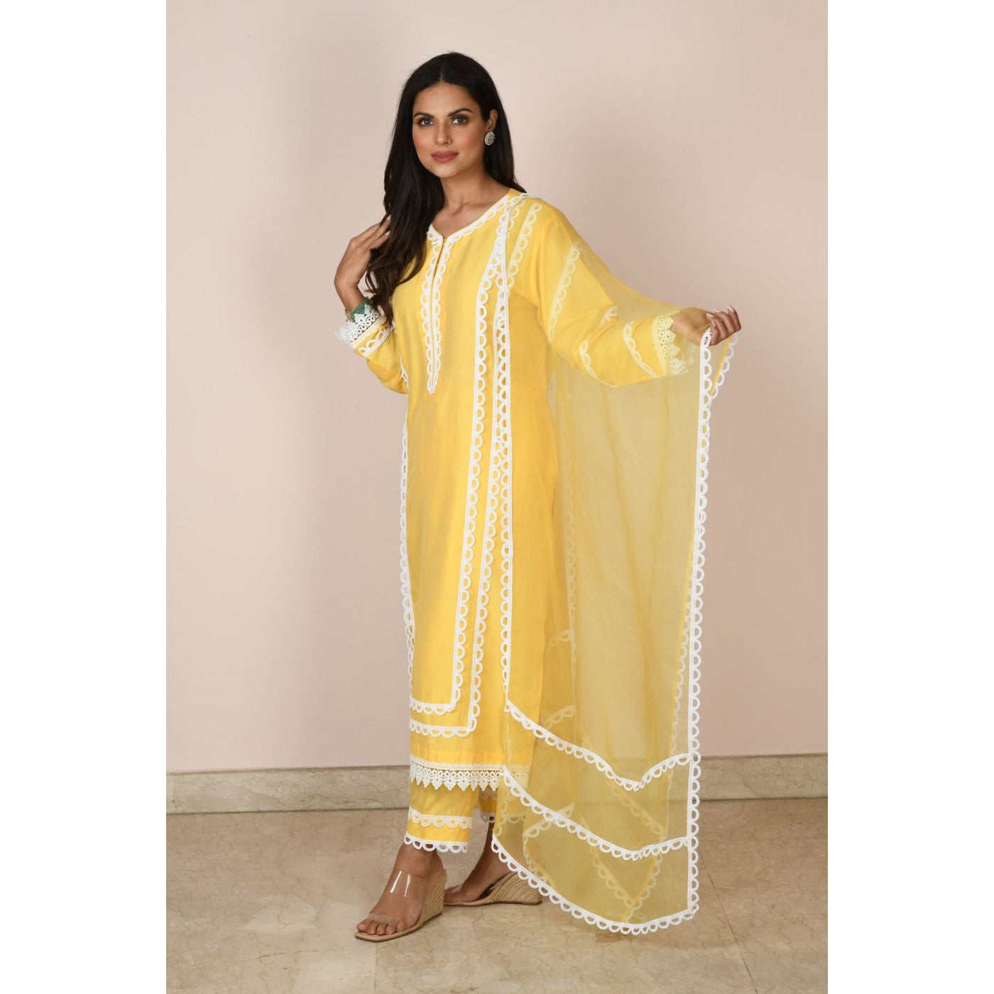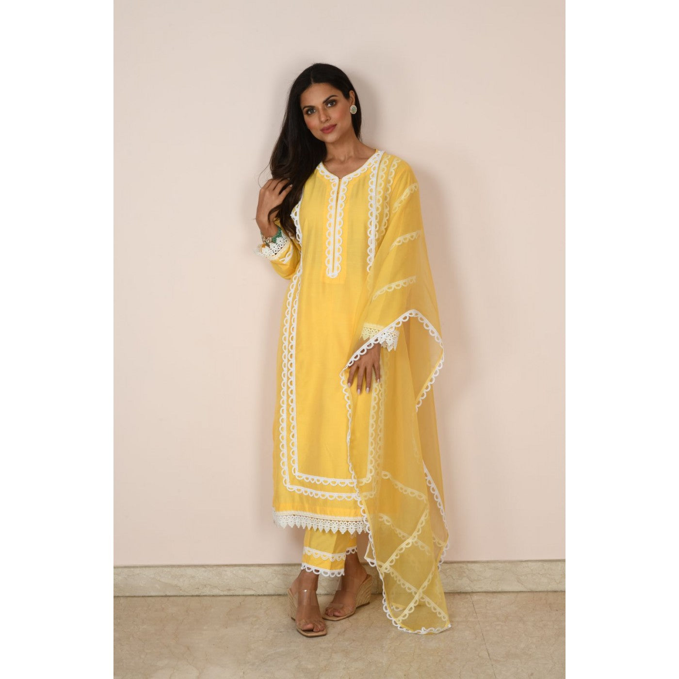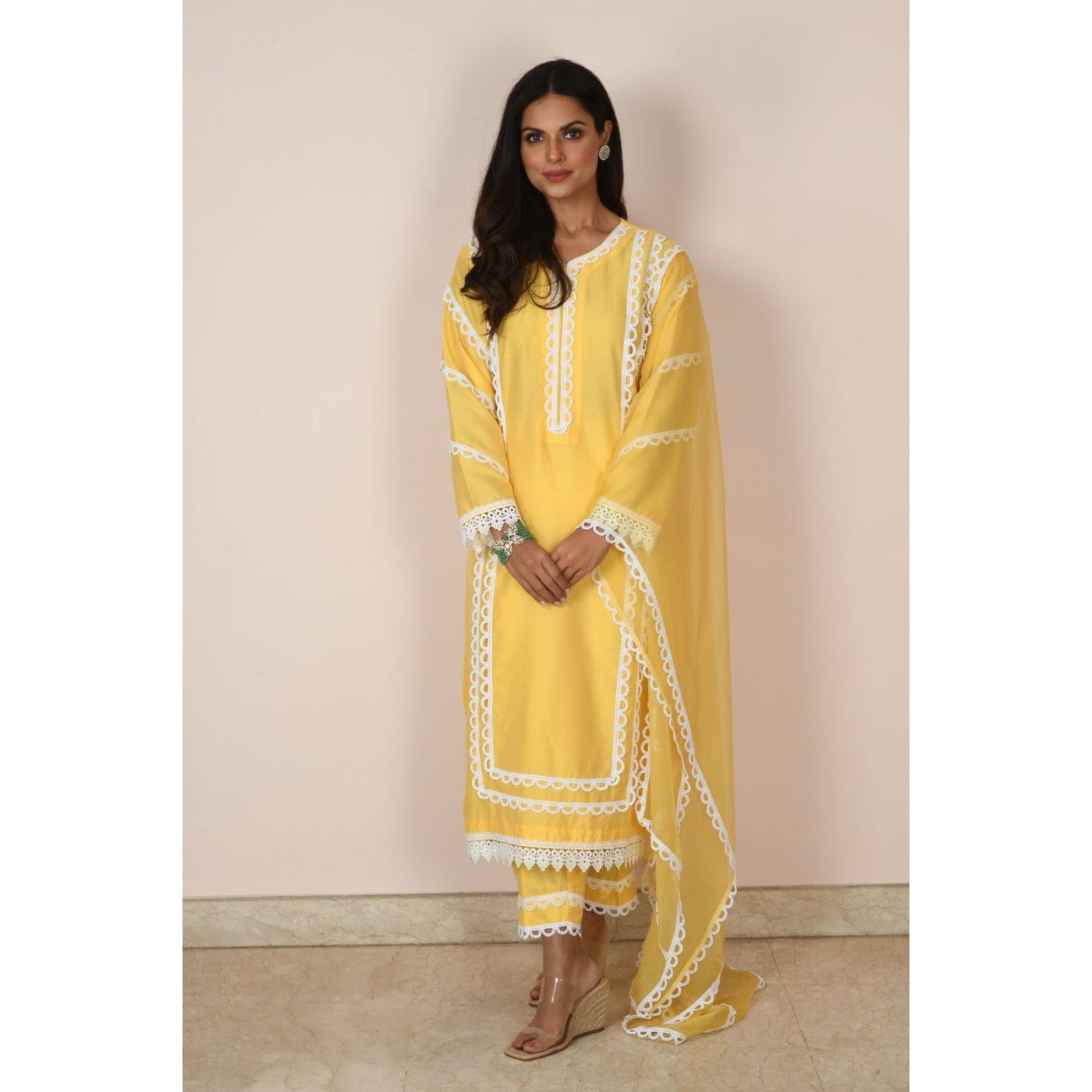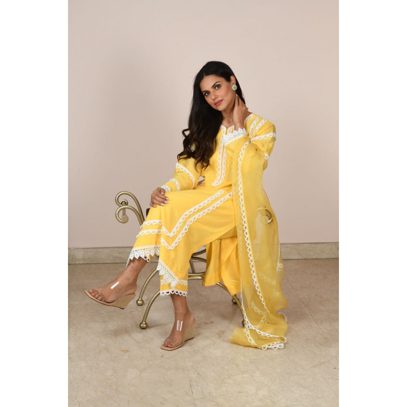 The simple elegance of this soft yellow set with fine laces is a wardrobe staple this season Paired here with tapered pants.