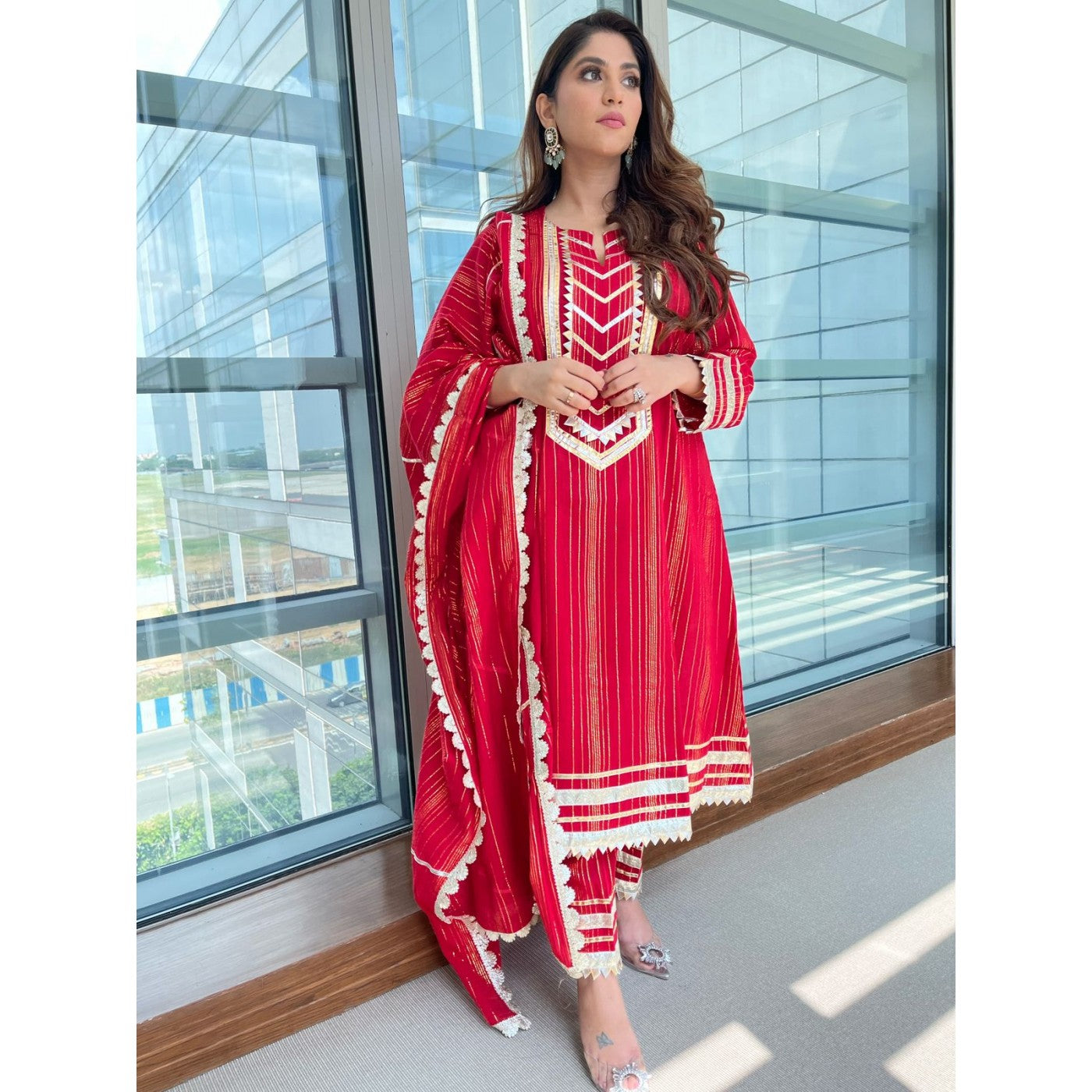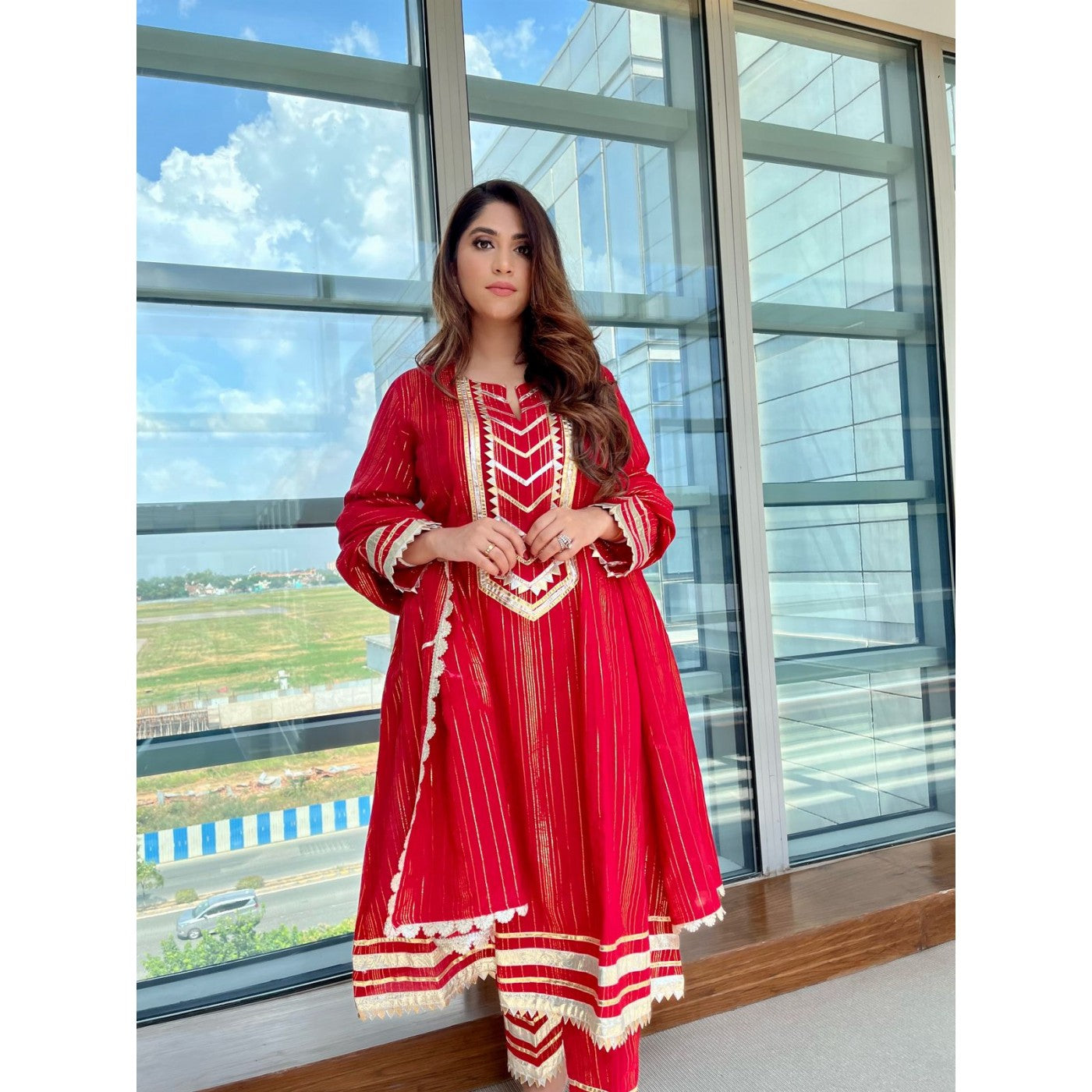 Redefine beauty in this scarlet red ensemble with woven gold lurex. Completed with dull gold and silver embossed gota presents an endlessly stylish and striking style !! Paired here with matching straight pants & dupatta.