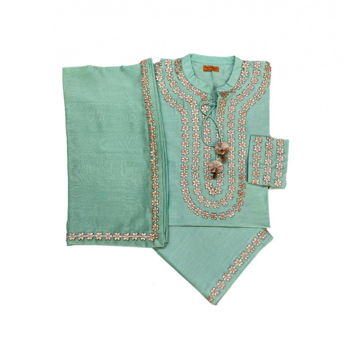 Magic is in the detailing. This subtle moss green suit is finely detailed with floral antique gota made by our local inhouse karigars. A dazzling Chanderi silk dupatta gives it a final touch of elegance for endless celebrations.