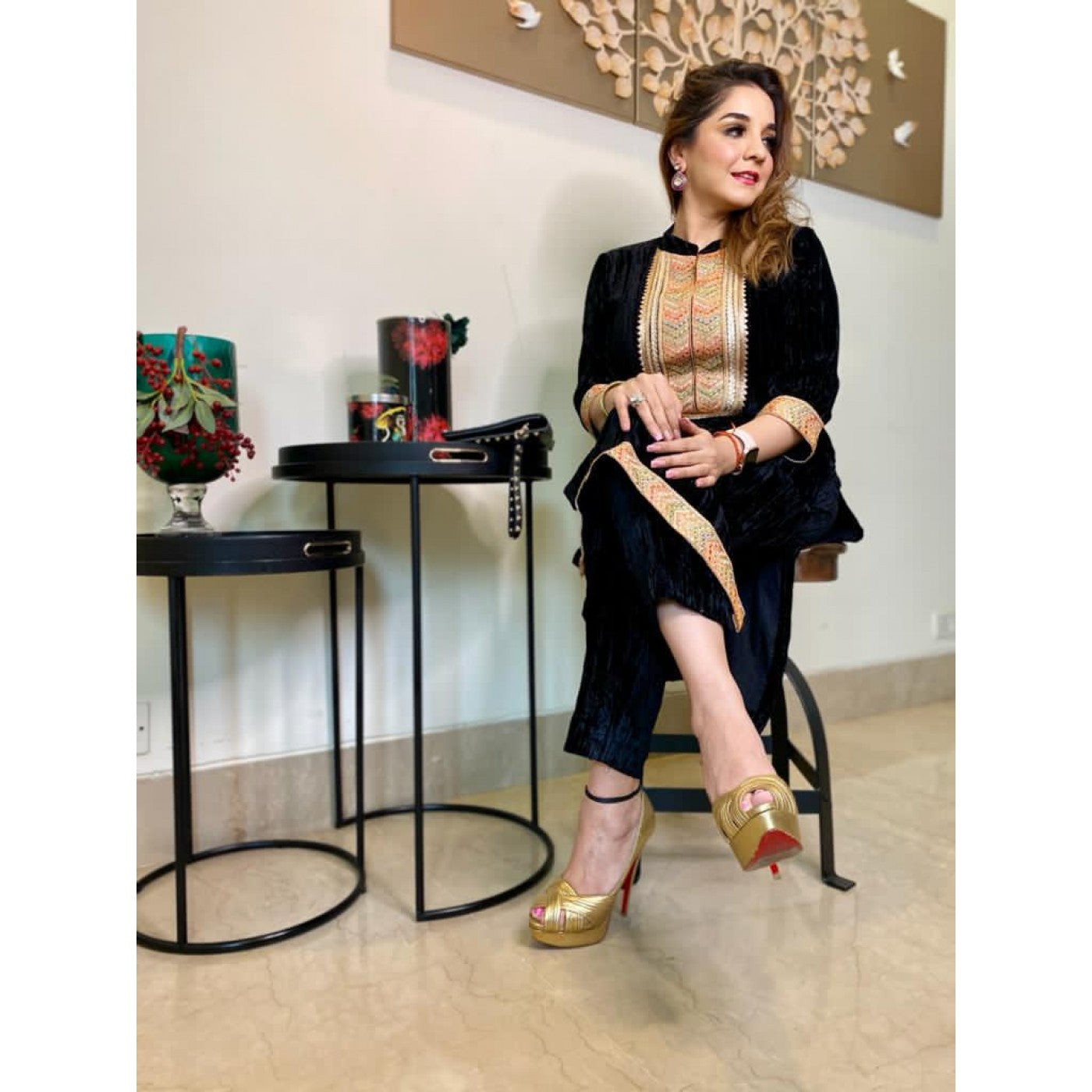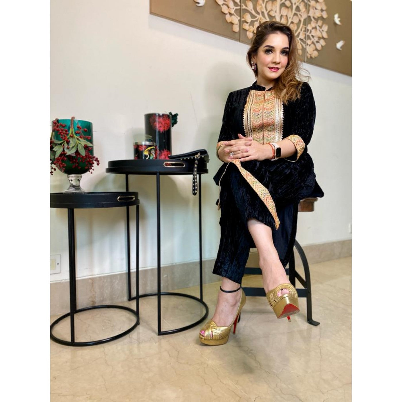 This stunning crinkle black velvet set is intricately enhanced with embroidered neckline with thread patterns in rich Kashmiri colour combinations of carnation pink, peach, grape green and dull gold .. styled here with velvet ankle pants tastefully designed for the winters.