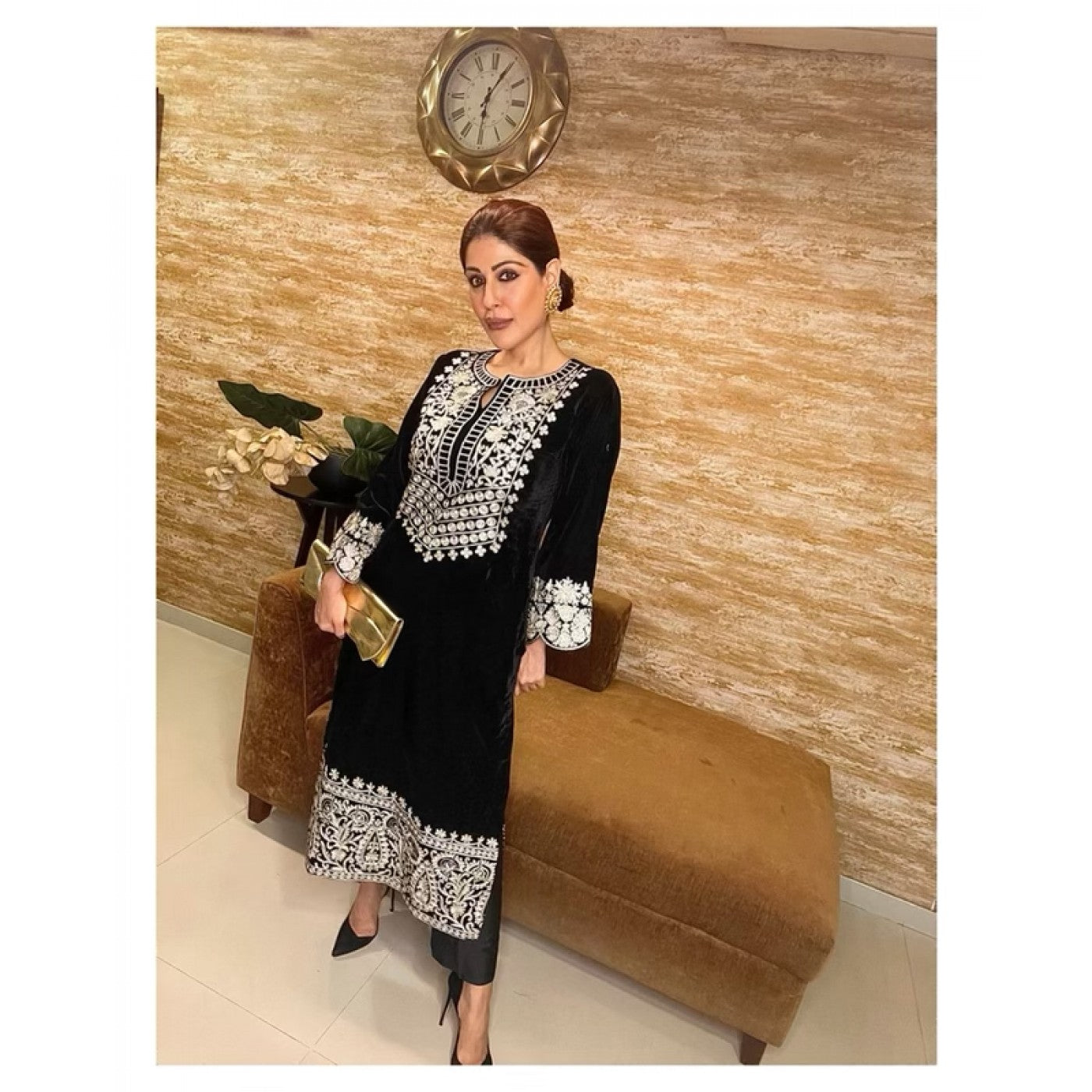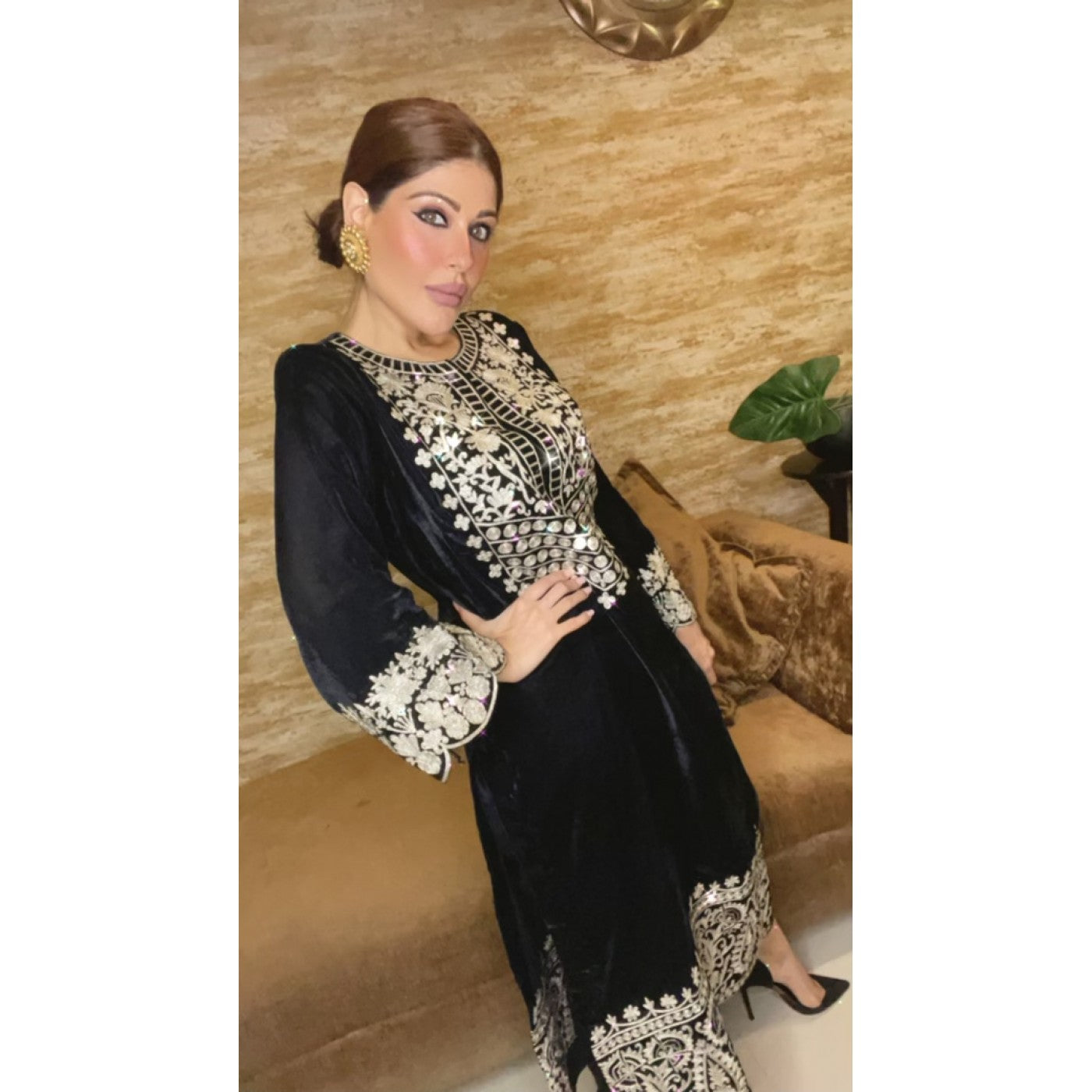 This breathtaking luxe & lavish black velvet kurta is intricately embroidered in dull gold zari work. Black cotton-silk pants complete the look. A statement and trendy monochrome look for the winter.