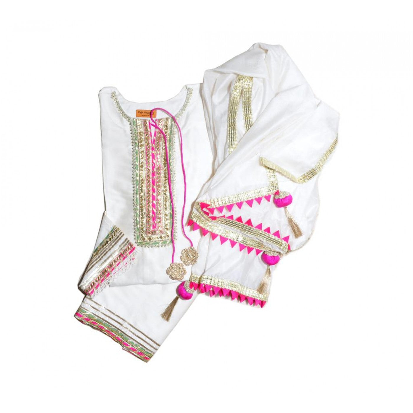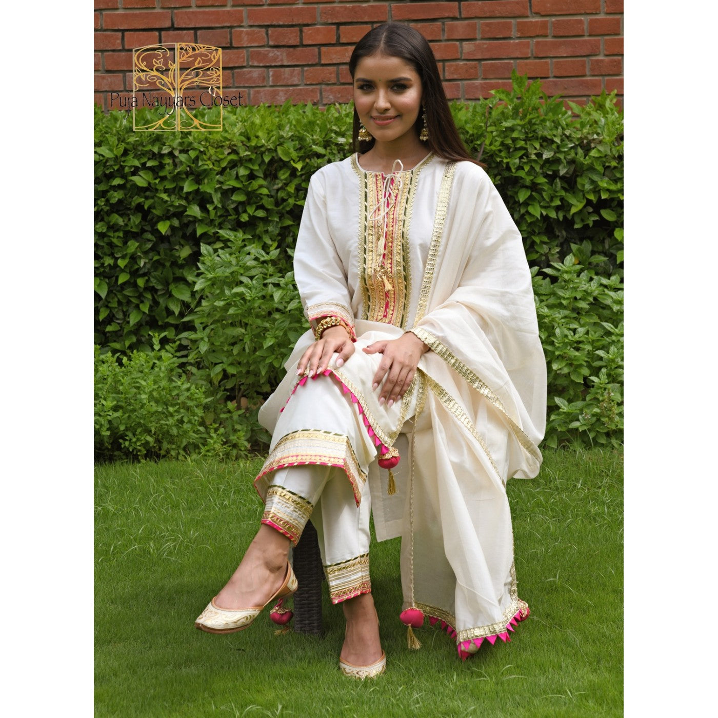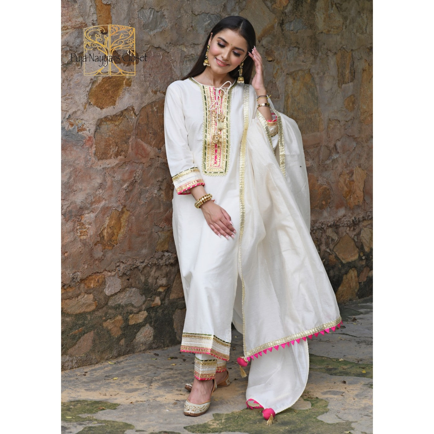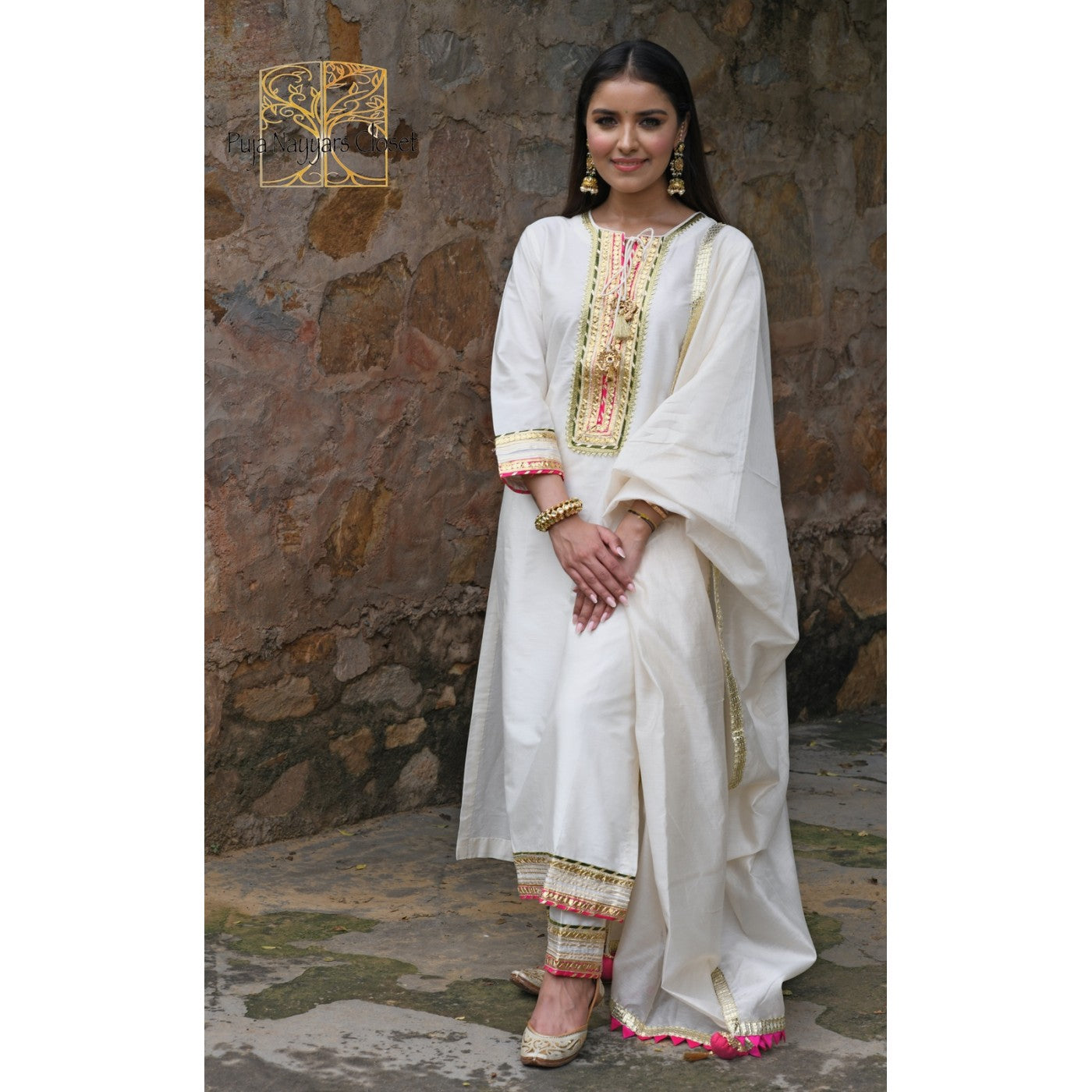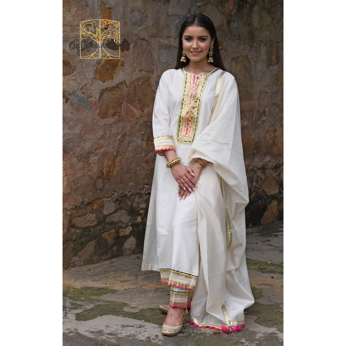 A lovely ivory kurta set with green, fuchsia pink and antique gold gota work. Paired with pants for an elegant heritage look and versatile enough to be worn on any occasion.