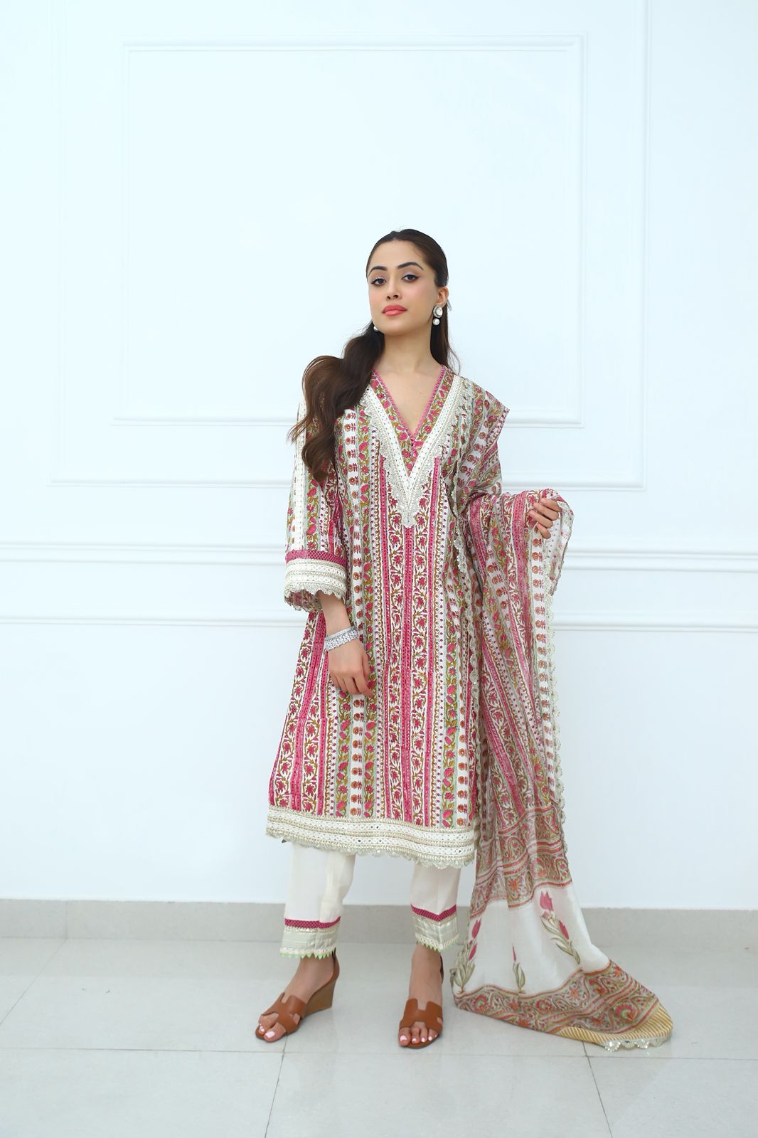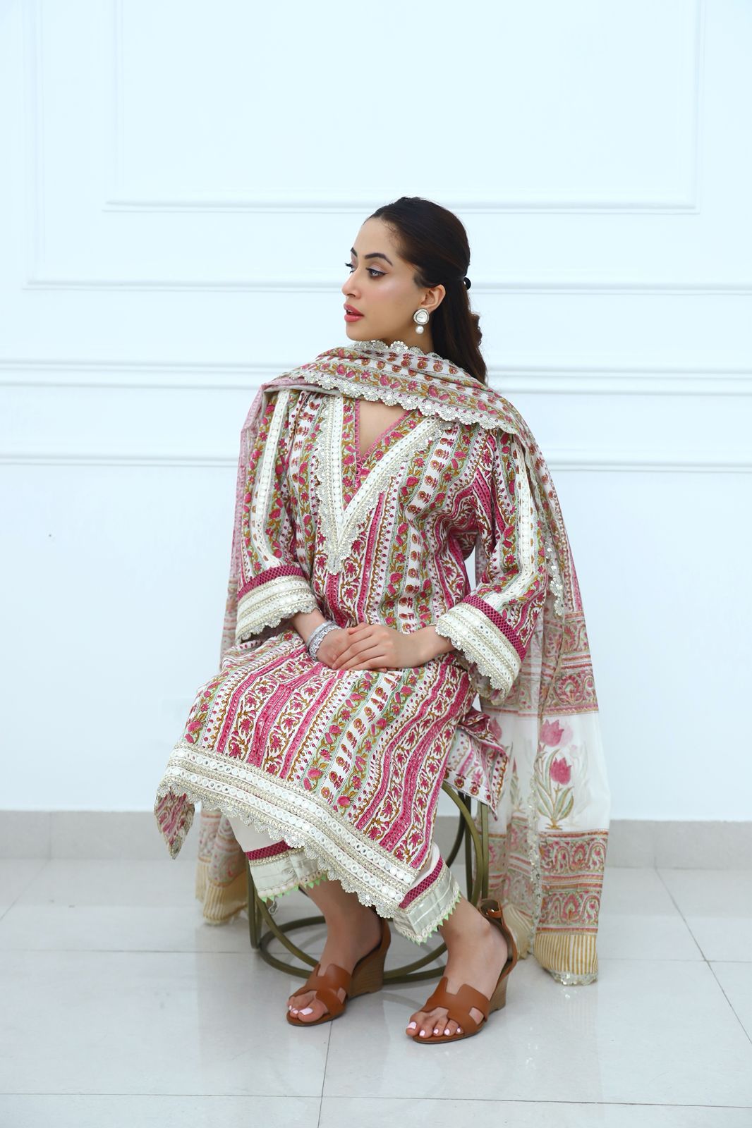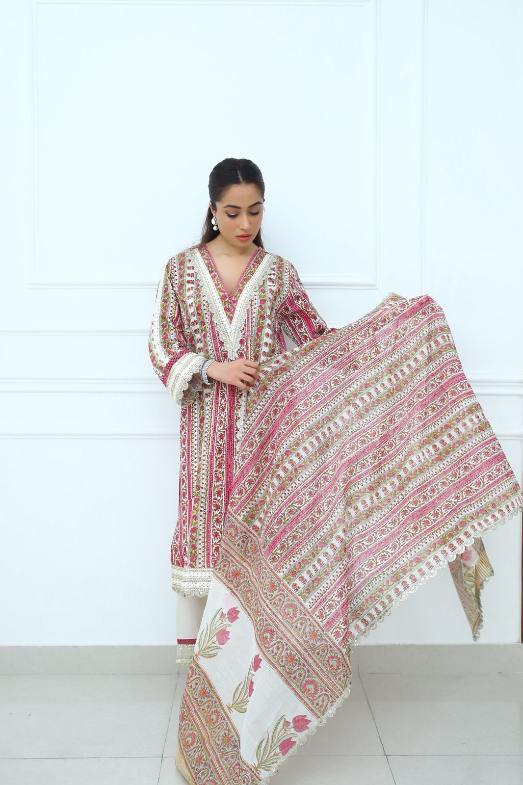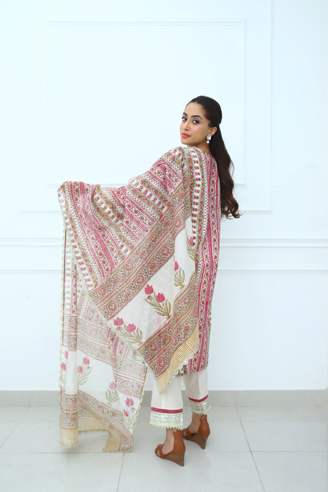 Elegance meets the royal richness of soft cottons.This flowing cotton fabric in vibrant colours is enhanced with gota and mirror work which signifies radiance . Paired with Ivory pants and a soft Chanderi duppatta.
