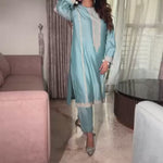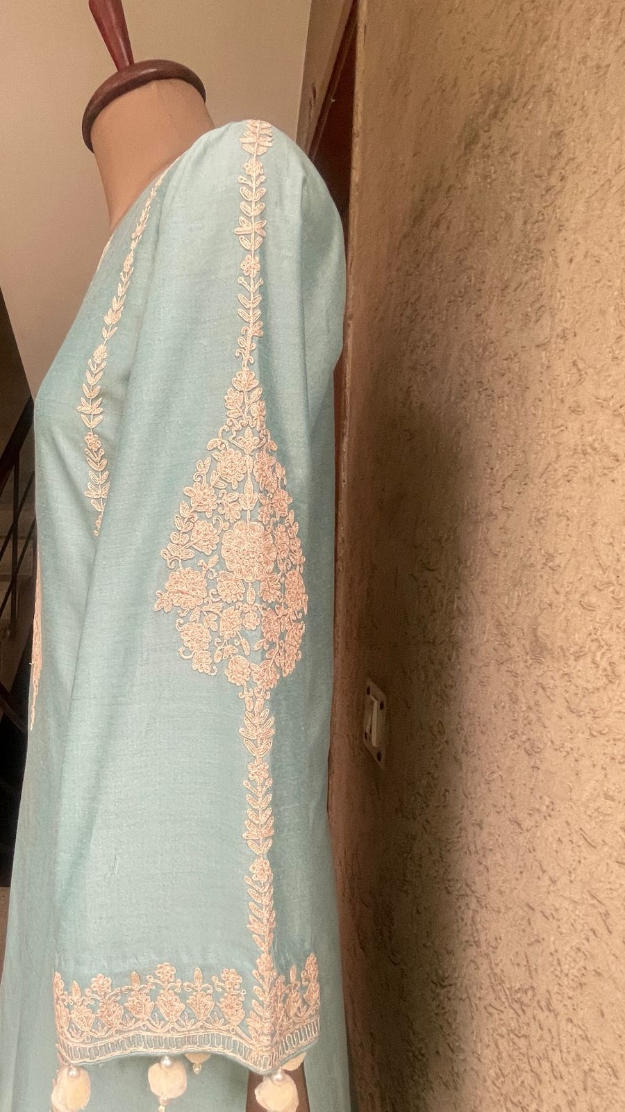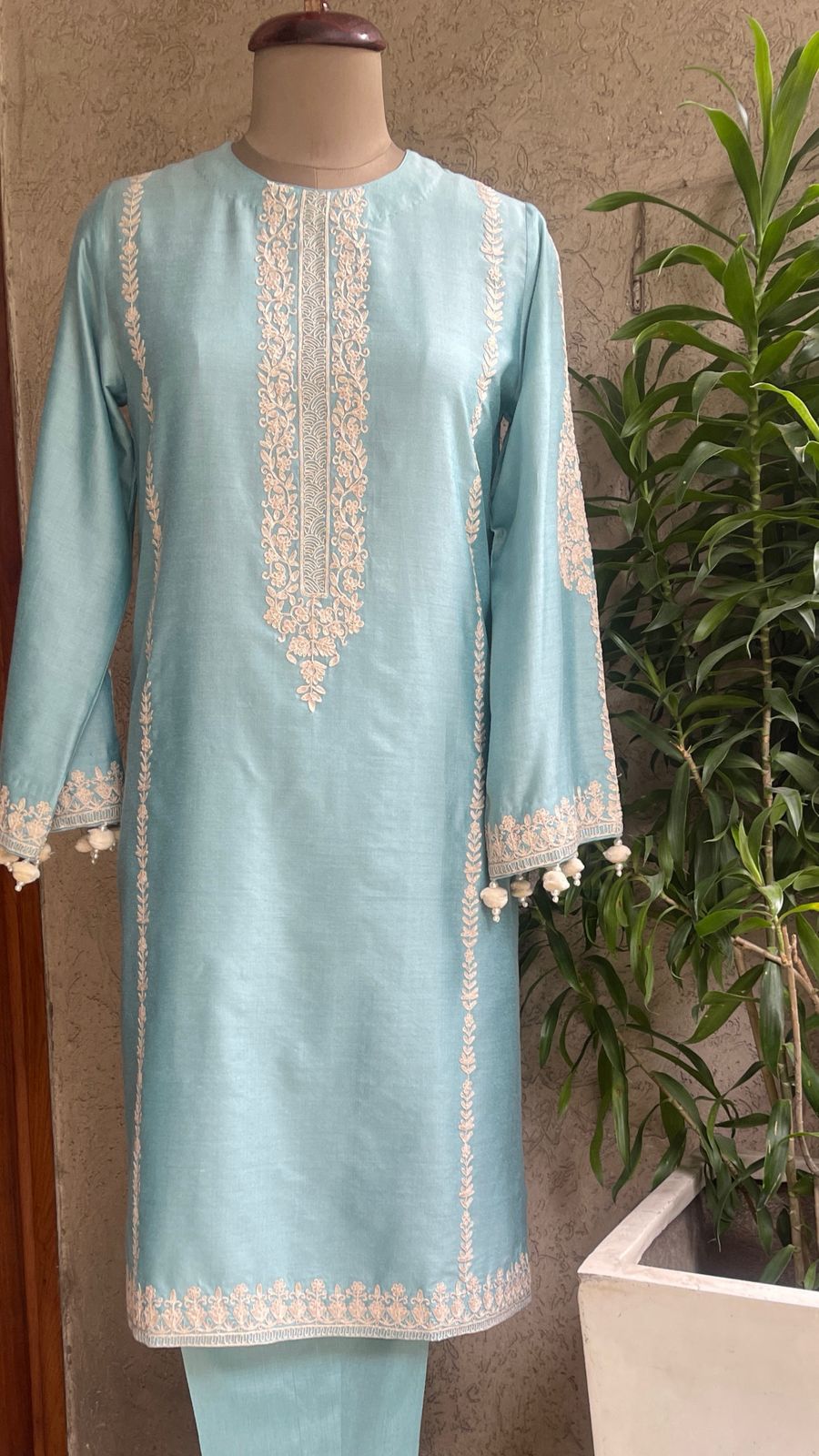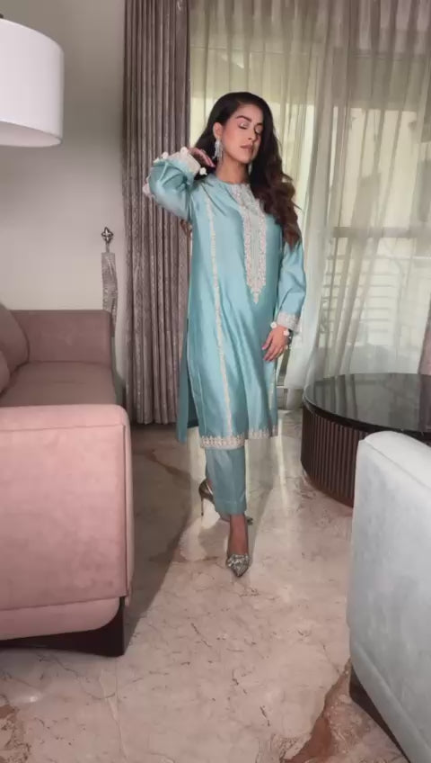 Unfiltered elegance… you will be flodded with compliments this season in this blue kurta set which is delicately embroidered in traditional Dori work. The Mughal motifs on the sleeves are the highlight. Paired with ankle pants.
