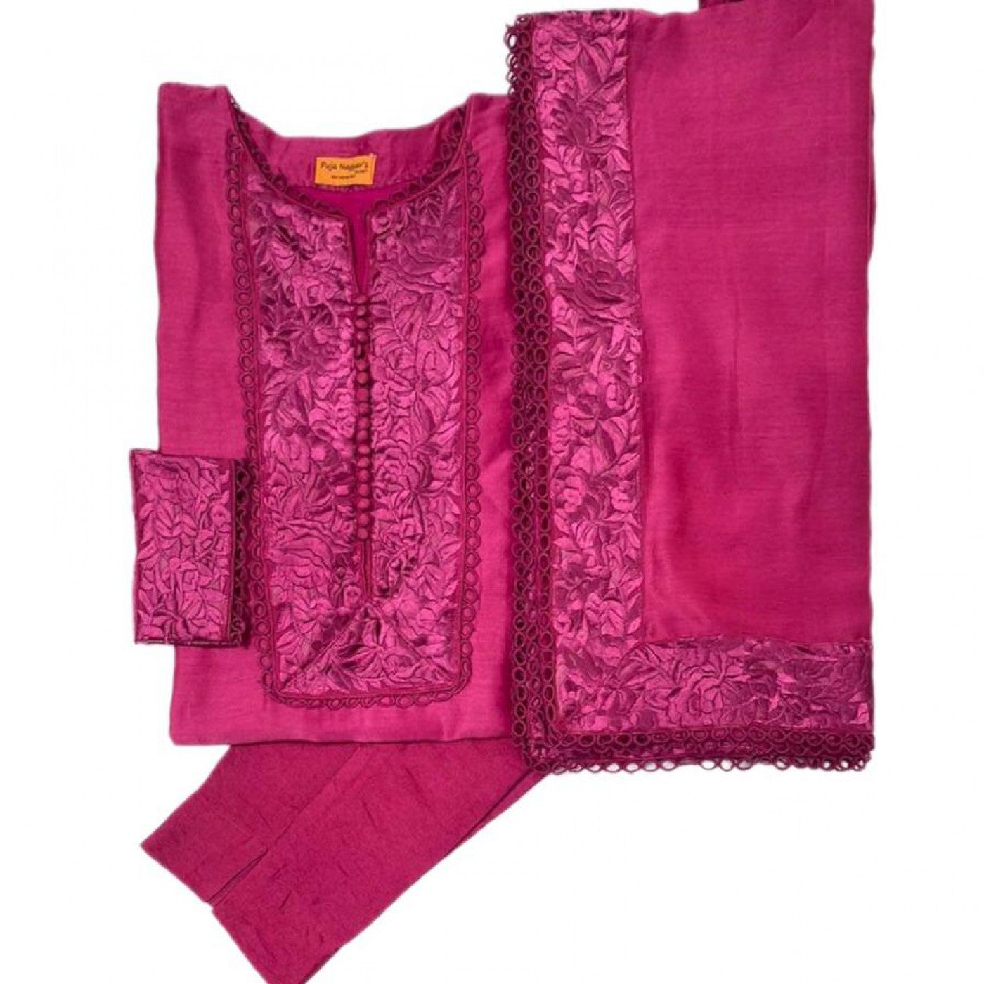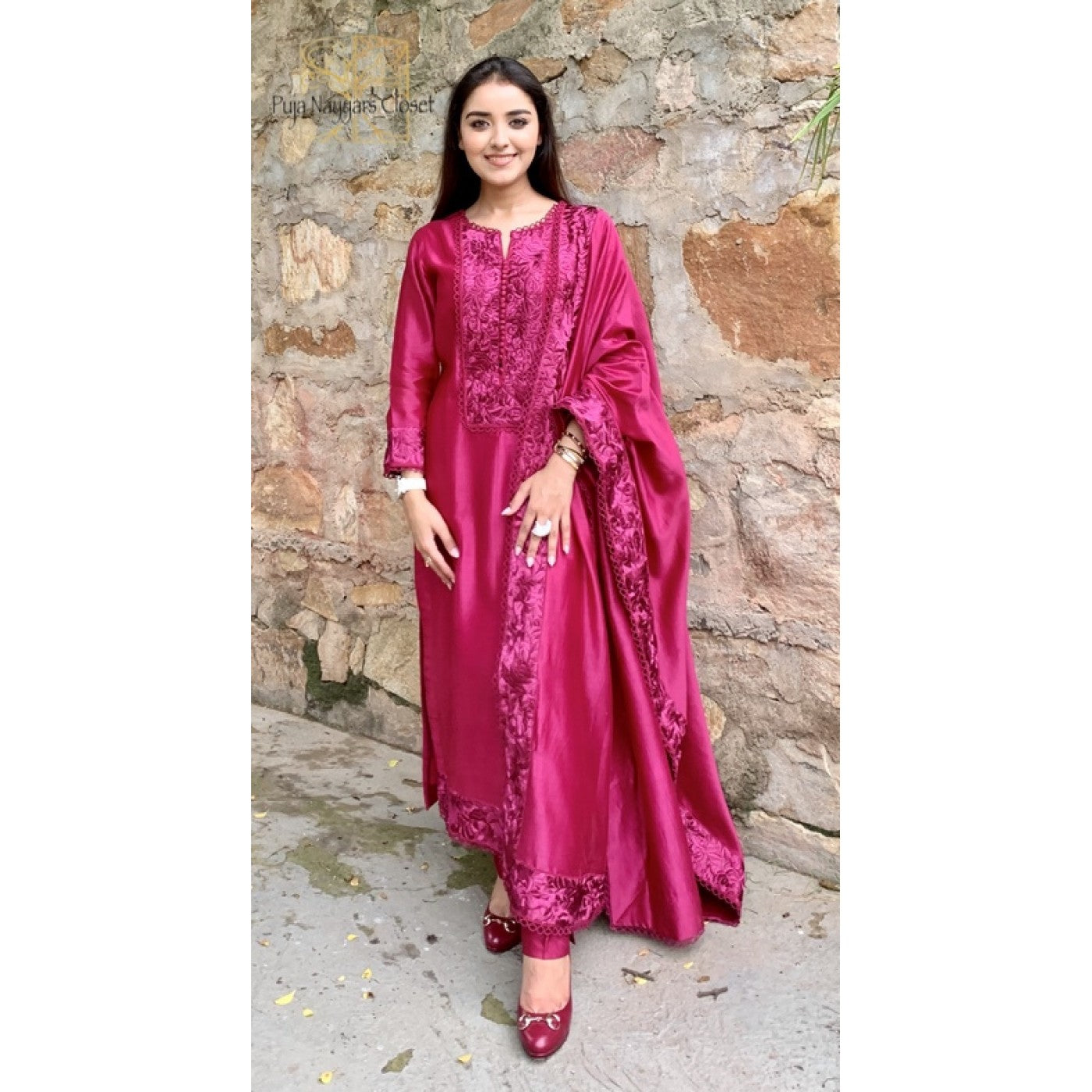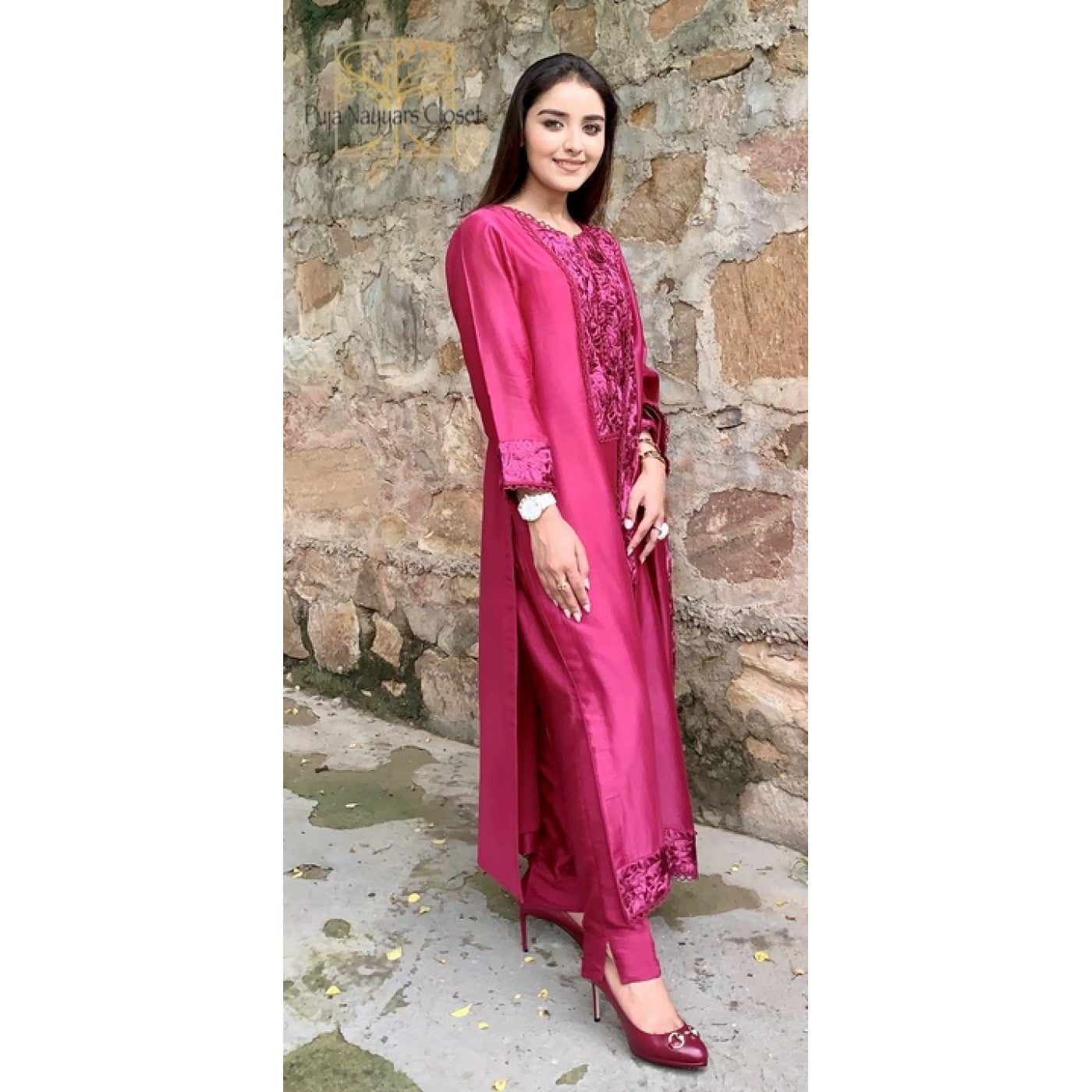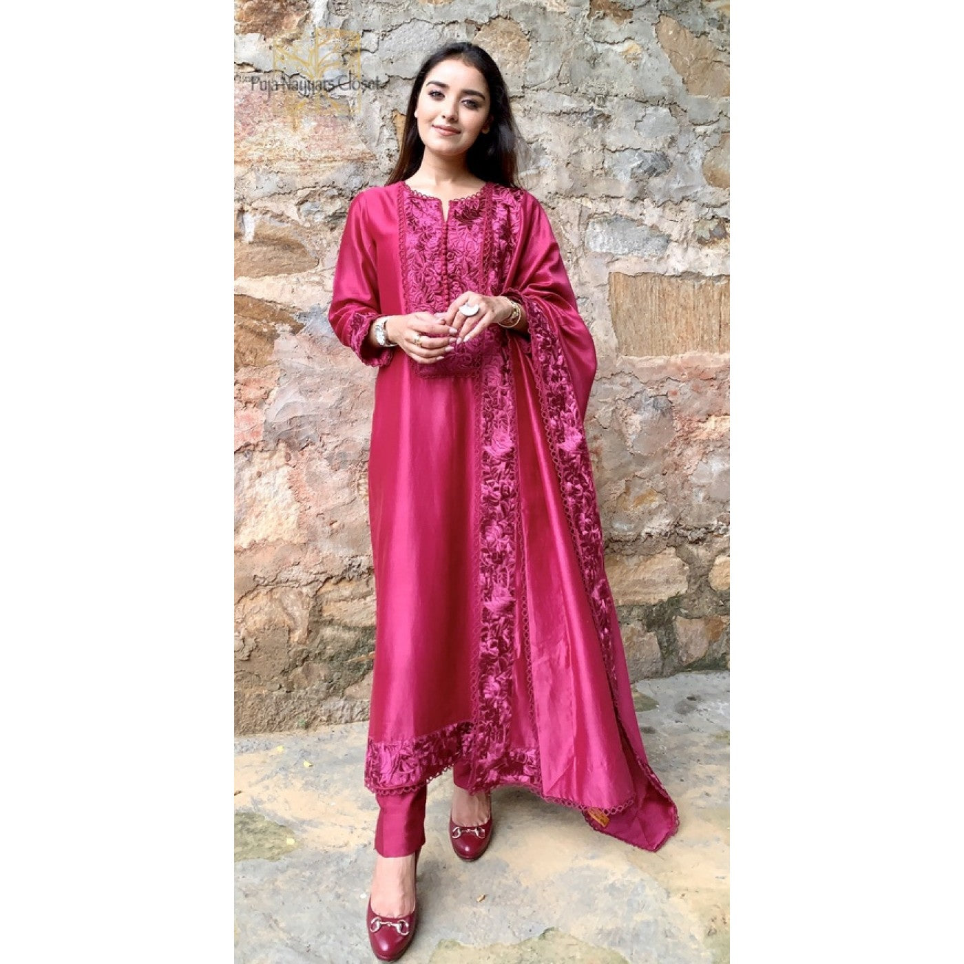 An intricately embroidered silhouette from our luxury collection in plum purple with additional delicate button & lace details. A four-sided embroidery border on the dupatta.