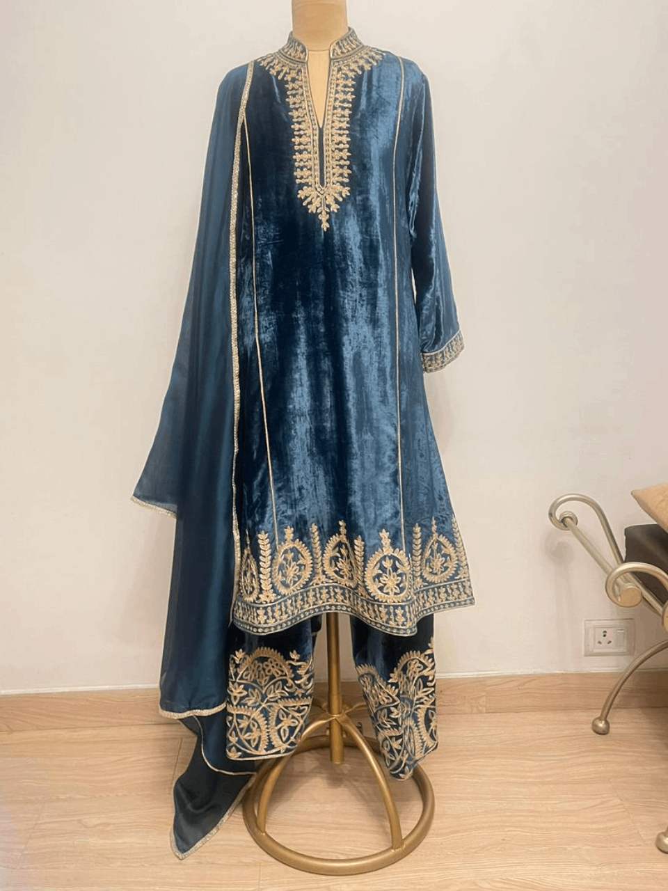 Maroon Velvet Kurta with Blue Salwar Set - LUXC 2039
