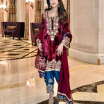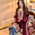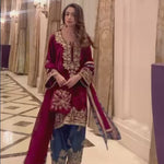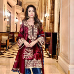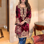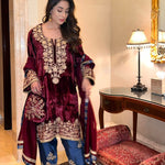 A masterpiece of Aari embroidery . A lush maroon velvet shirt is complimented with a captivating combination of an indigo blue salwar . The matching Chanderi silk Duppatta is adorned with the finest trimmings. Let’s add a touch of warmth to all winter occasions.