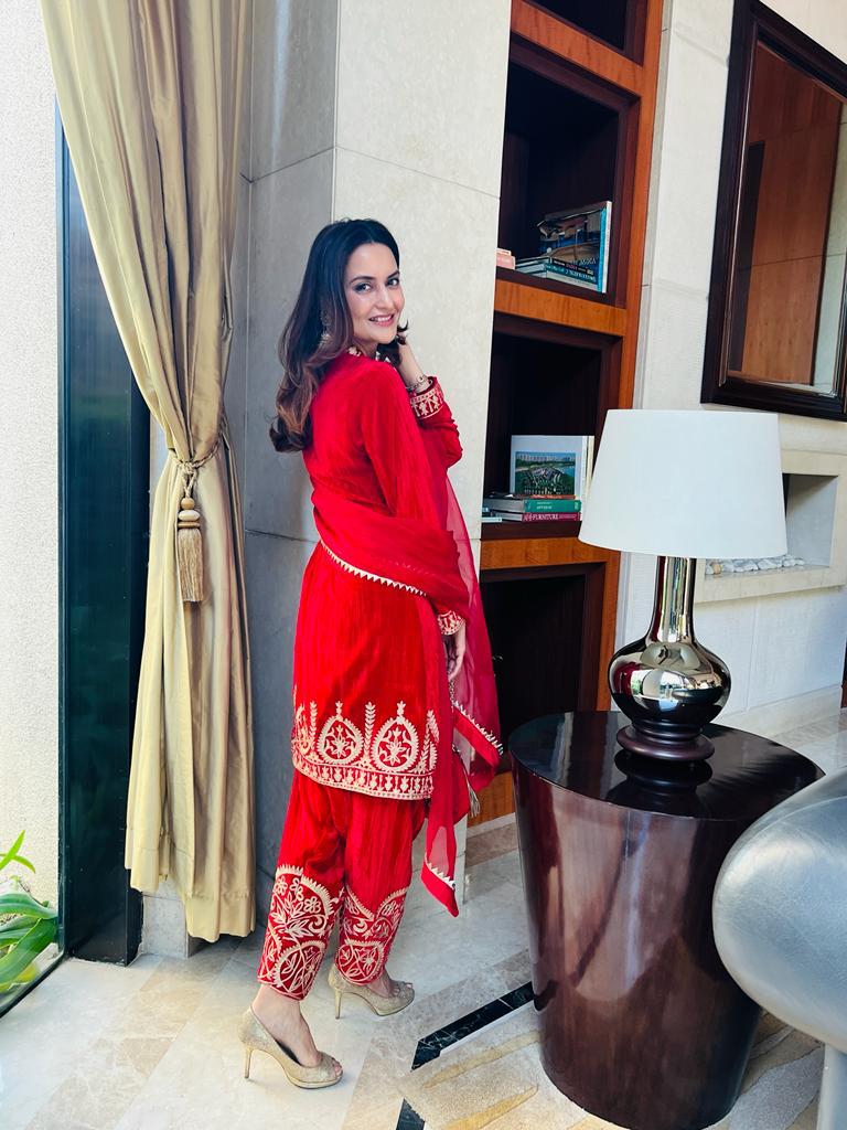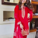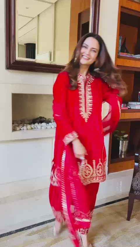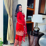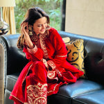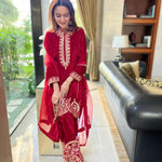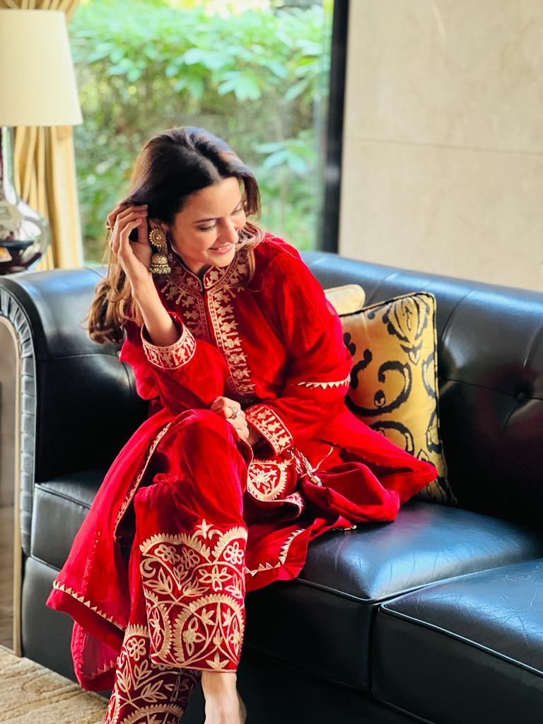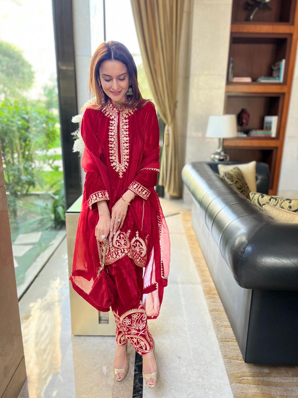 There is a shade of red for every woman on every occasion. This beautiful short kurta and salwar is delicately embroidered in traditional aari work. These luxurious velvets are a must have for every wardrobe. An organza duppatta completes the look.