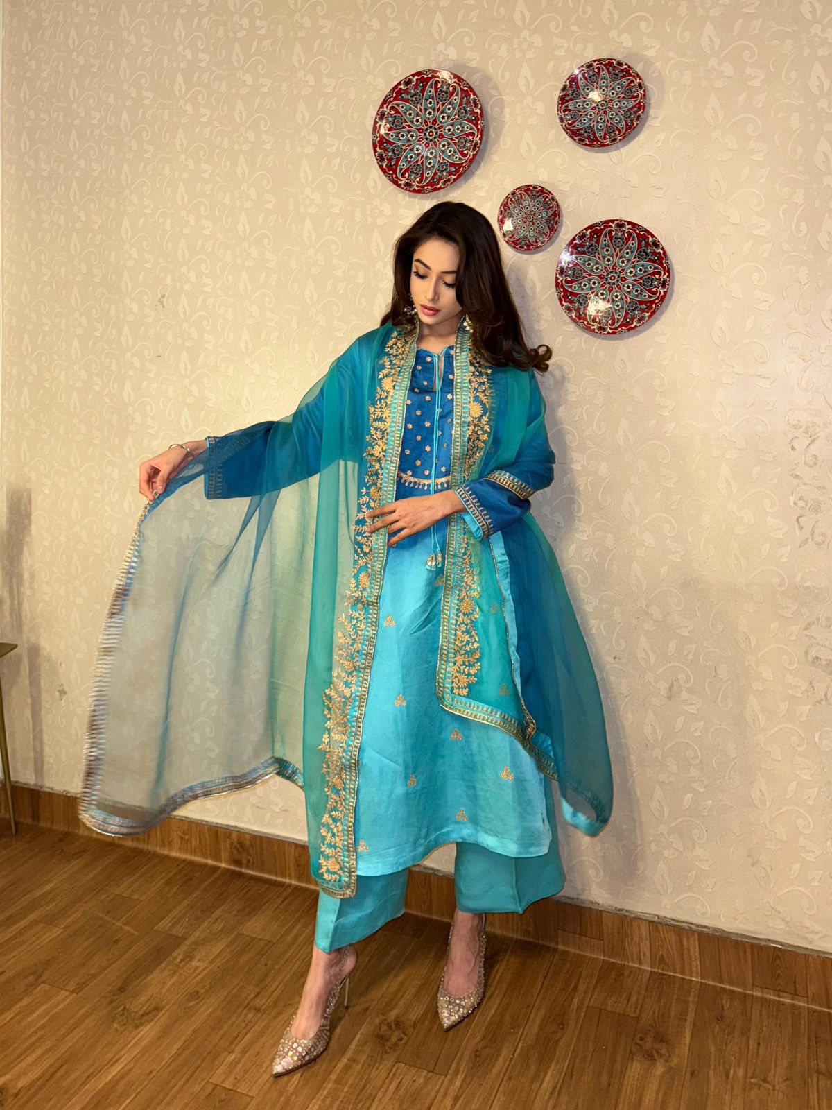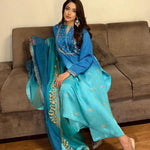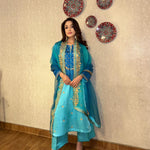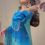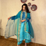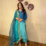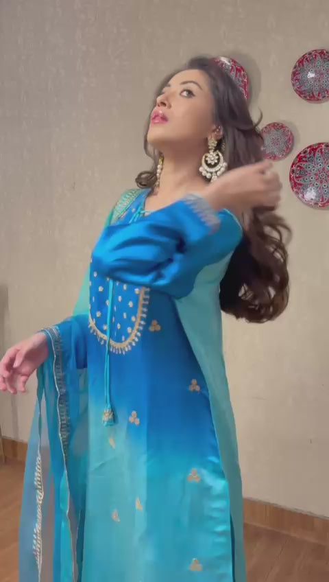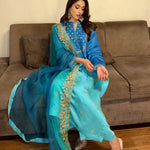 Delicate Aari embroidery with dynamic details on a shaded blue kurta. It’s paired with a shaded organza duppatta to enhance your look this season!
