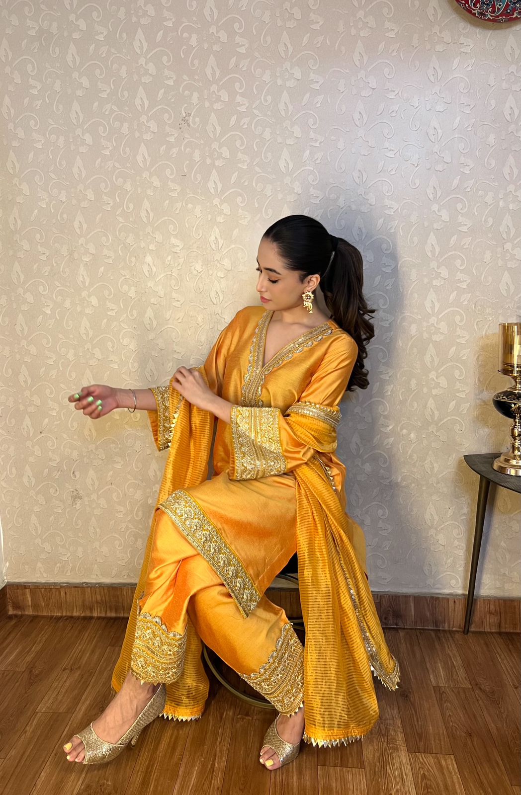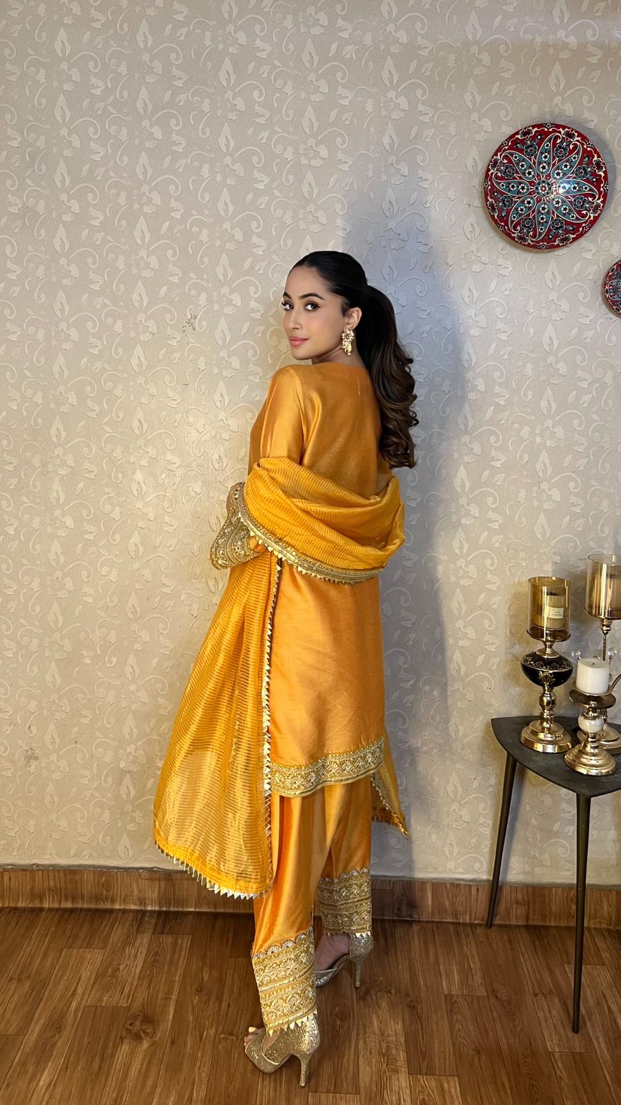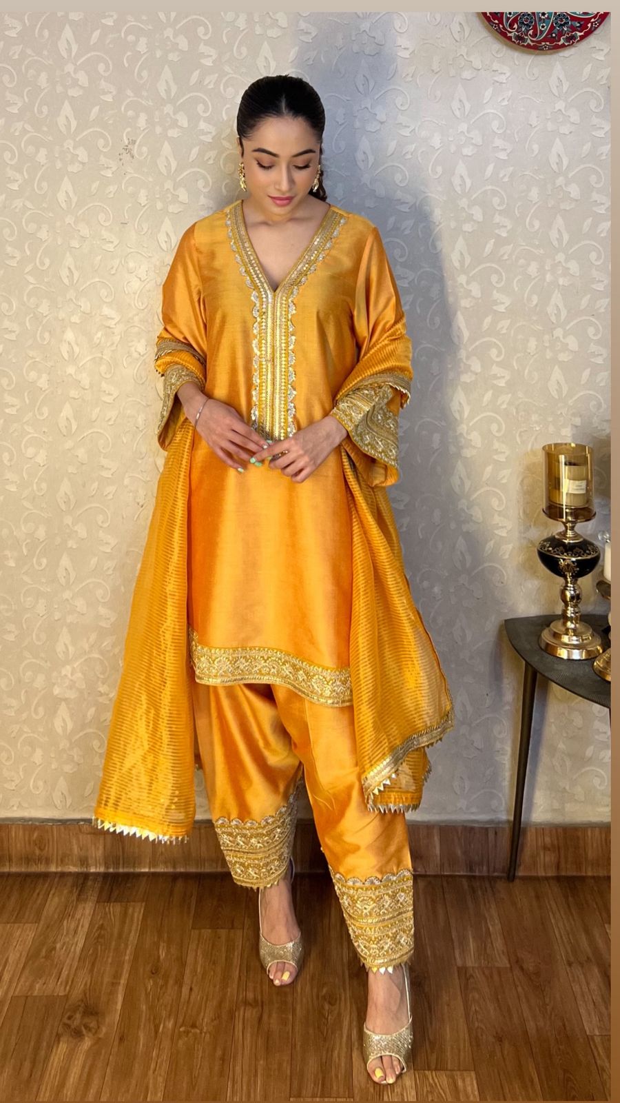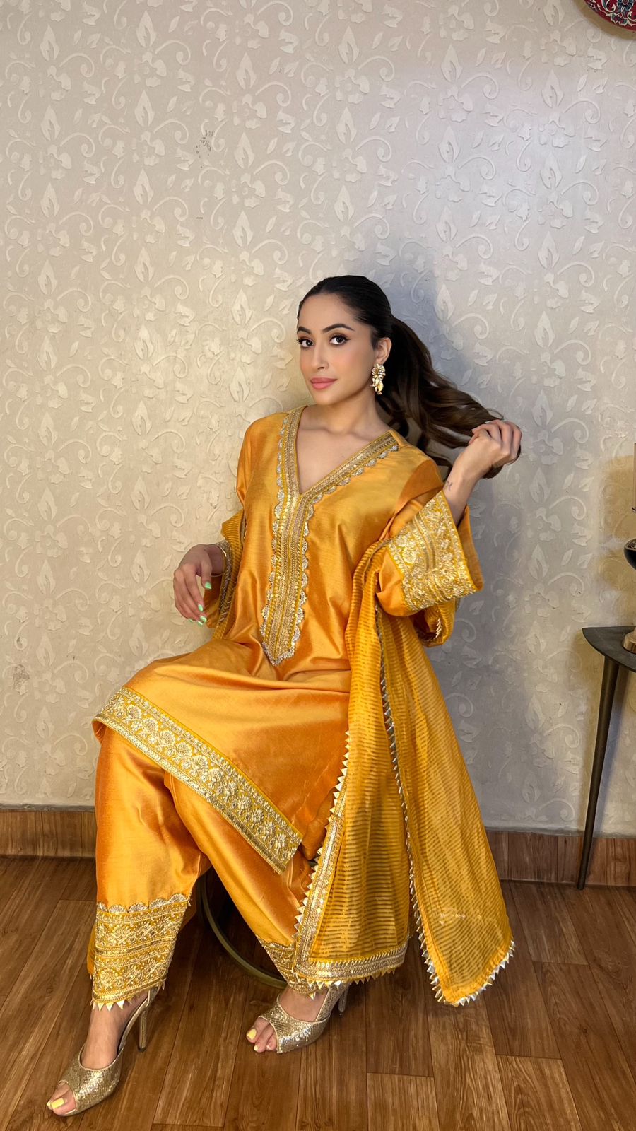 The intricate detailing on a mango yellow cotton silk kurta is adorning its neckline, sleeves and ghera. The matching salwar with similar detailng is an example of exquisite craftsmanship. The tissue duppatta makes it ideal to wear to any occasion. So this season immerse yourself in its richness