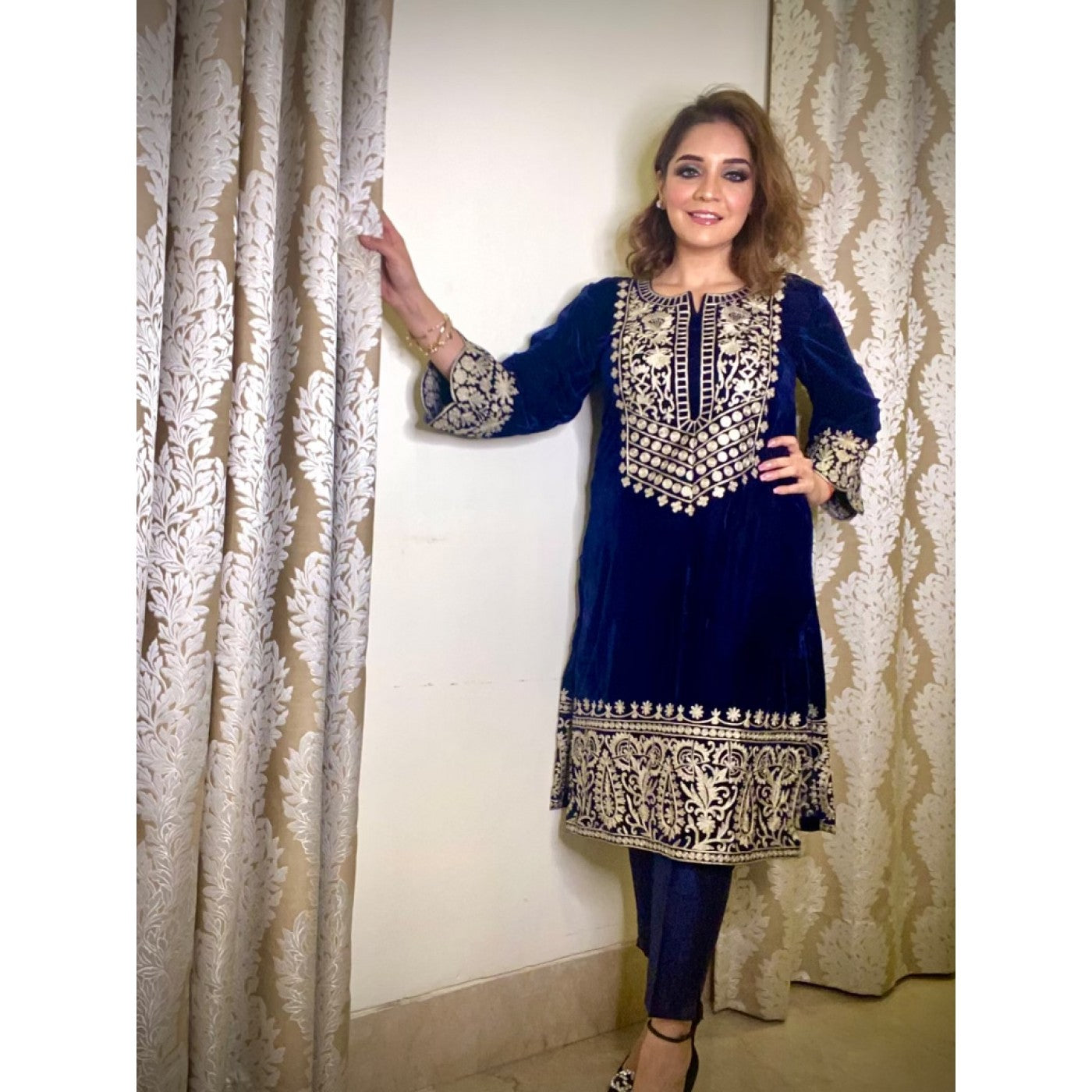 This dark blue velvet kurta is intricately embroidered in oxidised dull gold zari work with Mughal inspired motifs on the ghera with scalloped sleeves. Cotton silk pants complement the alluring kurta. A statement and trendy monochrome look for the winter.